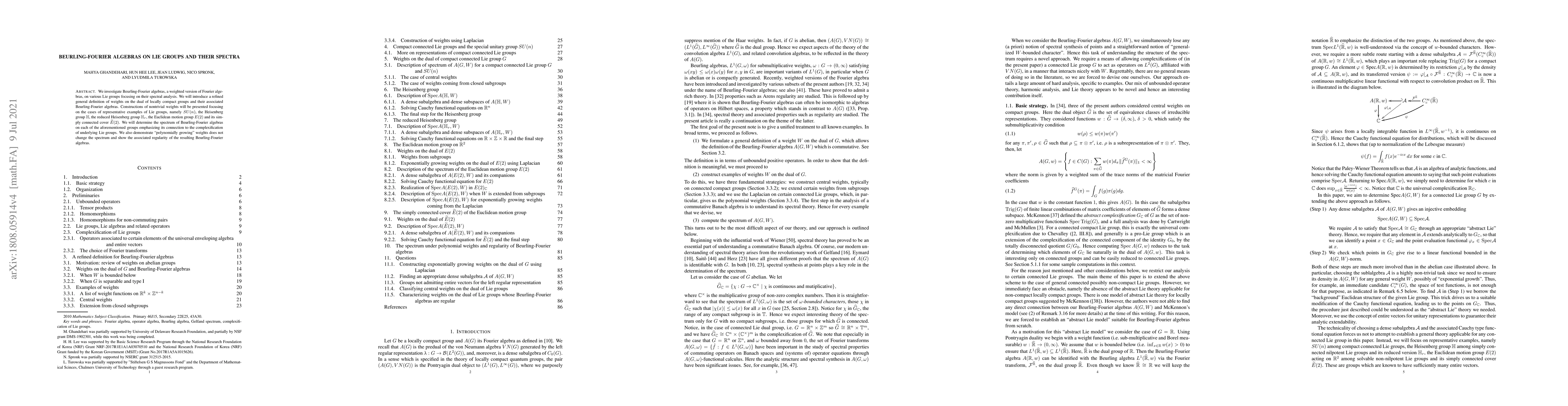 The research employs spectral analysis of Beurling-Fourier algebras on various Lie groups, introducing a refined definition of weights on the dual of locally compact groups and their associated Beurling-Fourier algebras. The paper constructs nontrivial weights for representative examples of Lie groups, including $SU(n)$, the Heisenberg group $\mathbb{H}$, the reduced Heisenberg group $\mathbb{H}_r$, the Euclidean motion group $E(2)$, and its simply connected cover $\widetilde{E}(2)$.