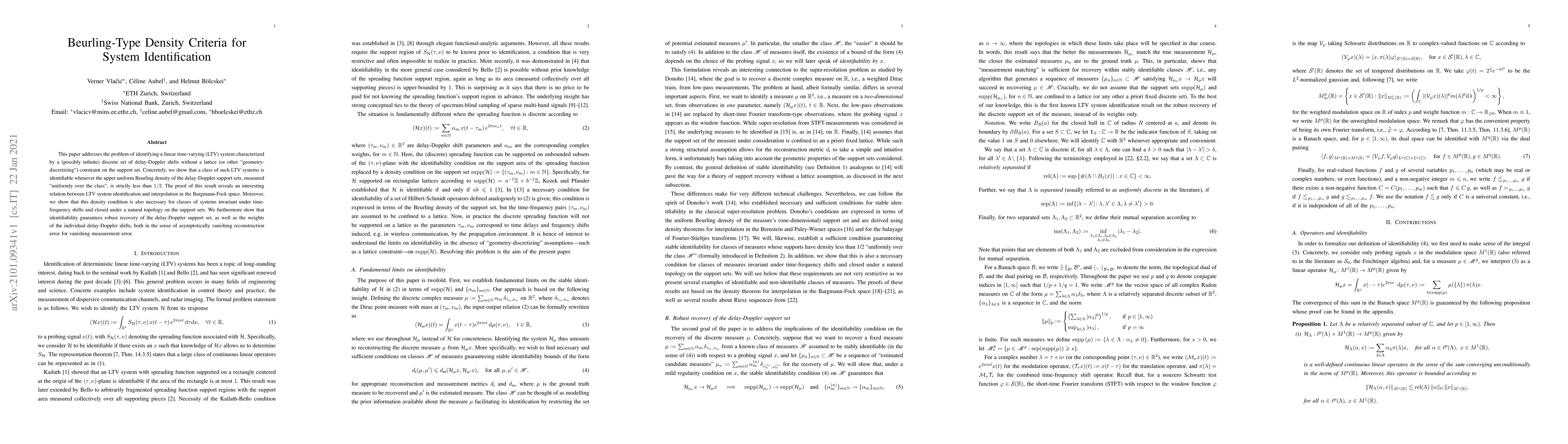 This paper addresses the problem of identifying a linear time-varying (LTV) system characterized by a (possibly infinite) discrete set of delay-Doppler shifts without a lattice (or other geometry-discretizing) constraint on the support set. Concretely, we show that a class of such LTV systems is identifiable whenever the upper uniform Beurling density of the delay-Doppler support sets, measured uniformly over the class, is strictly less than 1/2. The proof of this result reveals an interesting relation between LTV system identification and interpolation in the Bargmann-Fock space. Moreover, we show that this density condition is also necessary for classes of systems invariant under time-frequency shifts and closed under a natural topology on the support sets. We furthermore show that identifiability guarantees robust recovery of the delay-Doppler support set, as well as the weights of the individual delay-Doppler shifts, both in the sense of asymptotically vanishing reconstruction error for vanishing measurement error.