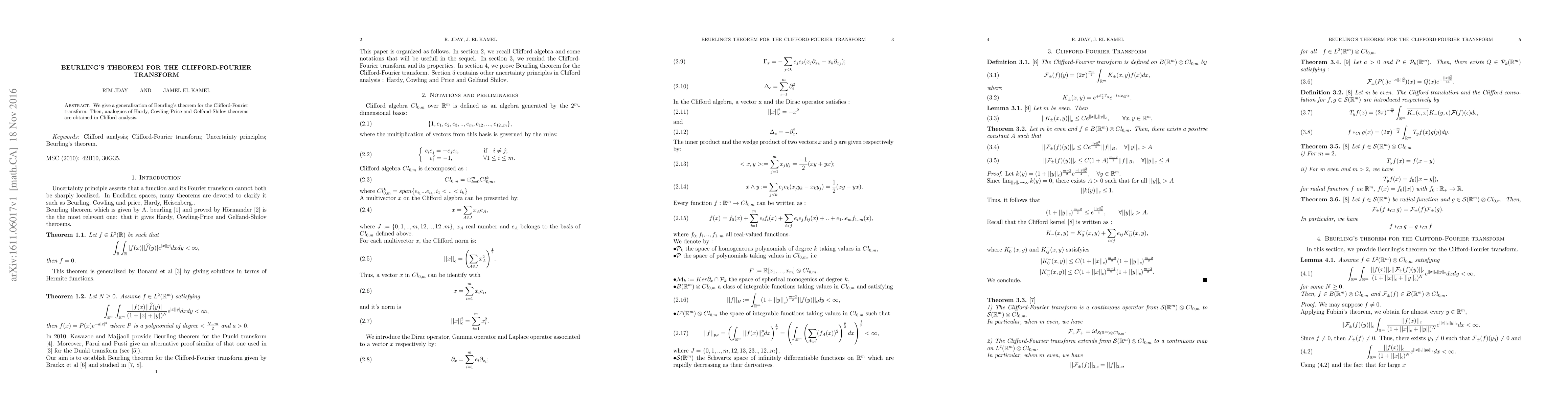 Summary: This paper generalizes Beurling's theorem to the Clifford-Fourier transform and derives analogues of Hardy, Cowling-Price, and Gelfand-Shilov theorems within the framework of Clifford analysis.