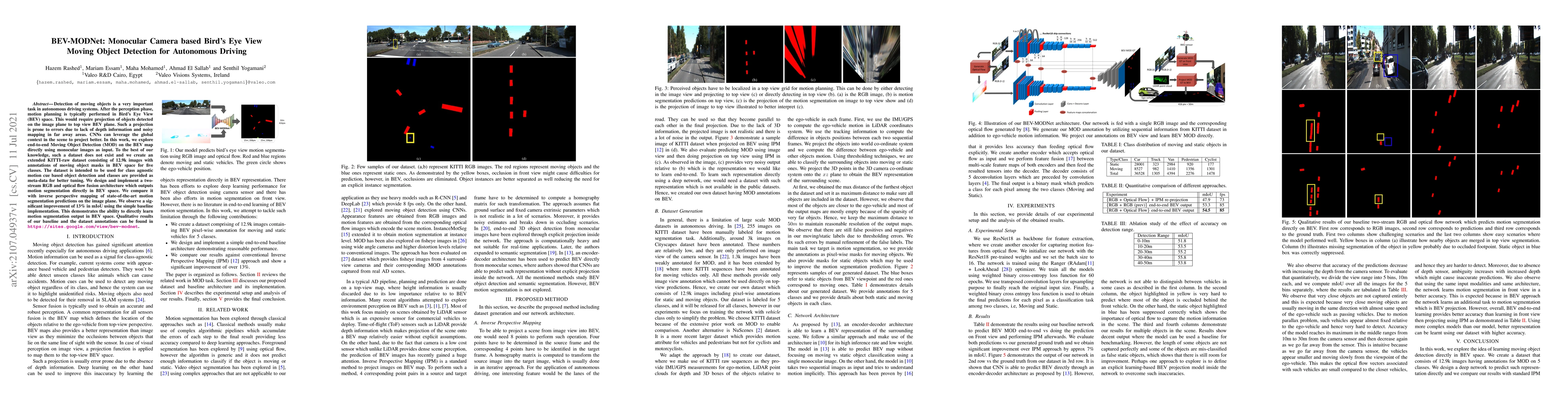This paper introduces BEV-MODNet, a novel method for detecting moving objects in Bird's Eye View (BEV) space from monocular camera inputs, crucial for autonomous driving. The authors create a new dataset with 12.9k annotated images for BEV-based moving object detection and propose a two-stream CNN architecture that significantly outperforms traditional inverse perspective mapping methods, achieving a 13% improvement in mean Intersection over Union (mIoU).