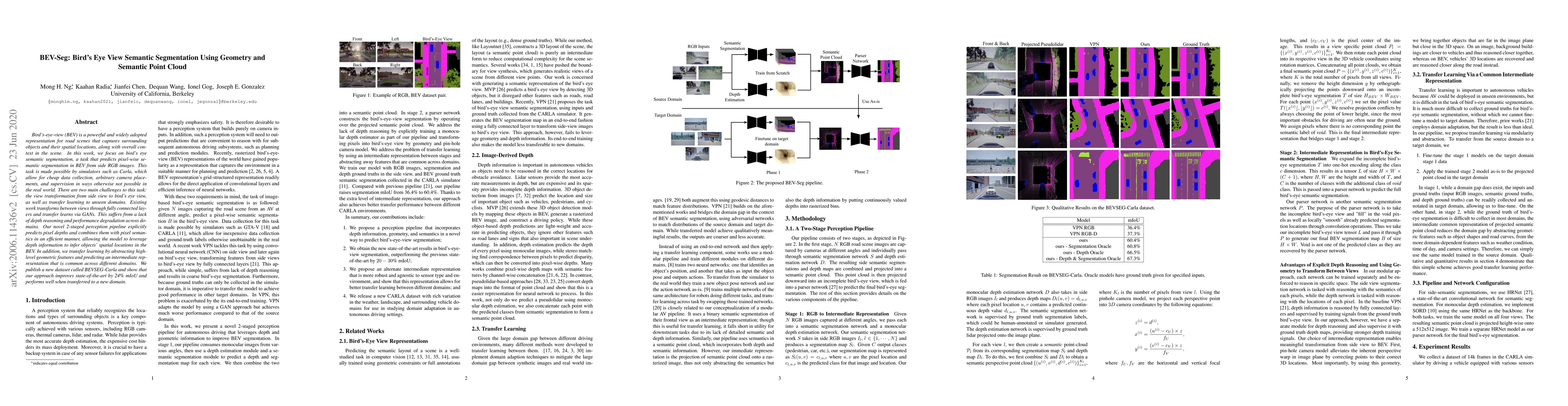 This paper introduces BEV-Seg, a method for bird's eye view semantic segmentation using geometry and semantic point clouds. It proposes a 2-staged perception pipeline that predicts pixel depths and combines them with semantics to infer spatial locations, improving depth reasoning. The approach also abstracts high-level geometric features for effective transfer learning, achieving a 24% improvement in mIoU and demonstrating good domain transfer performance.