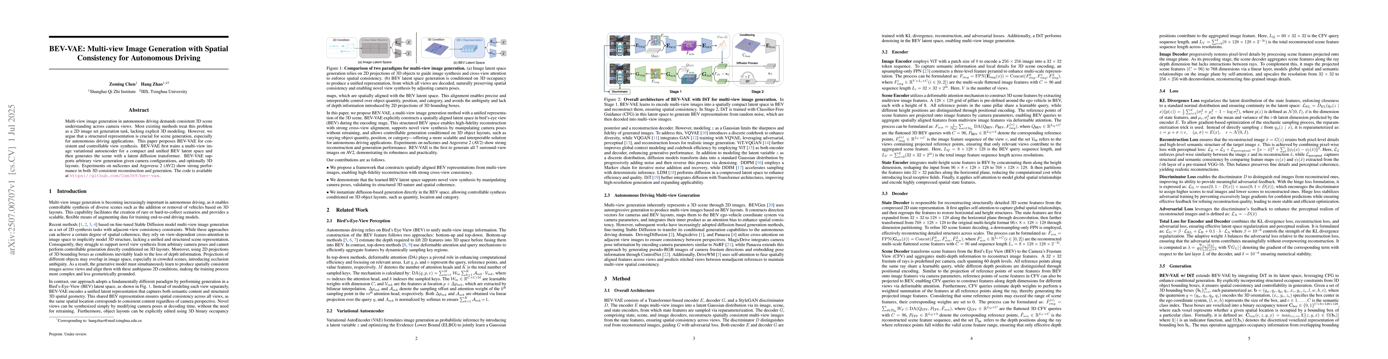 Multi-view image generation in autonomous driving demands consistent 3D scene understanding across camera views. Most existing methods treat this problem as a 2D image set generation task, lacking explicit 3D modeling. However, we argue that a structured representation is crucial for scene generation, especially for autonomous driving applications. This paper proposes BEV-VAE for consistent and controllable view synthesis. BEV-VAE first trains a multi-view image variational autoencoder for a compact and unified BEV latent space and then generates the scene with a latent diffusion transformer. BEV-VAE supports arbitrary view generation given camera configurations, and optionally 3D layouts. Experiments on nuScenes and Argoverse 2 (AV2) show strong performance in both 3D consistent reconstruction and generation. The code is available at: https://github.com/Czm369/bev-vae.