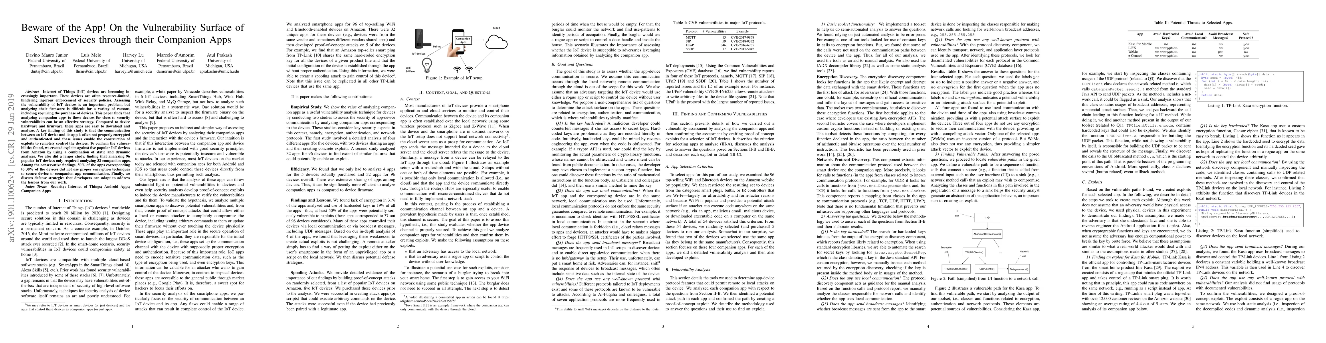Internet of Things (IoT) devices are becoming increasingly important. These devices are often resource-limited, hindering rigorous enforcement of security policies. Assessing the vulnerability of IoT devices is an important problem, but analyzing their firmware is difficult for a variety of reasons, including requiring the purchase of devices. This paper finds that analyzing companion apps to these devices for clues to security vulnerabilities can be an effective strategy. Compared to device hardware and firmware, these apps are easy to download and analyze. A key finding of this study is that the communication between an IoT device and its app is often not properly encrypted and authenticated and these issues enable the construction of exploits to remotely control the devices. To confirm the vulnerabilities found, we created exploits against five popular IoT devices from Amazon by using a combination of static and dynamic analyses. We also did a larger study, finding that analyzing 96 popular IoT devices only required analyzing 32 companion apps. Among the conservative findings, 50% of the apps corresponding to 38% of the devices did not use proper encryption techniques to secure device to companion app communication. Finally, we discuss defense strategies that developers can adapt to address the lessons from our work.