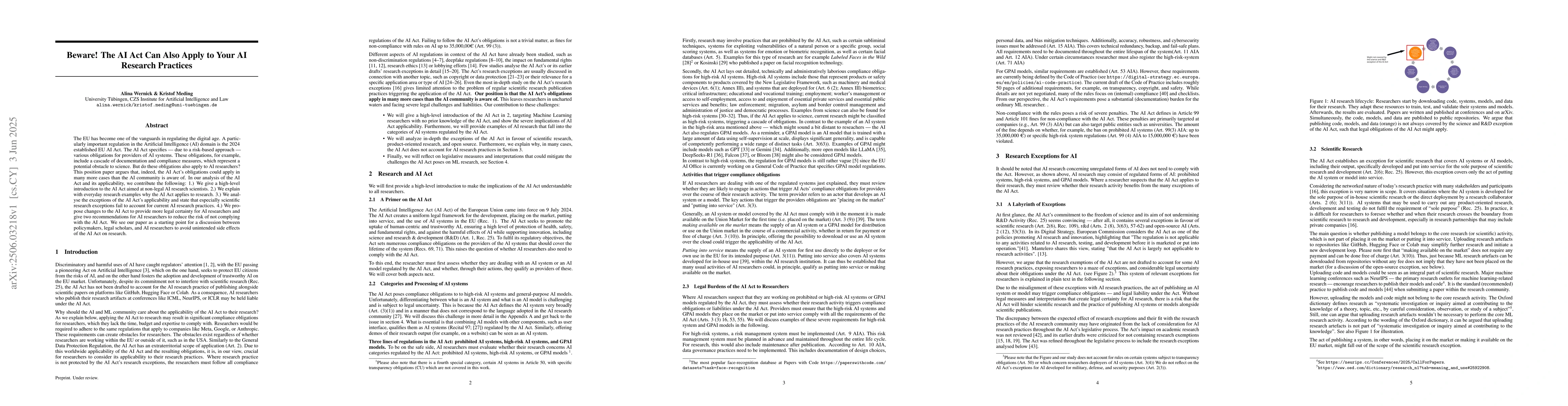 The EU has become one of the vanguards in regulating the digital age. A particularly important regulation in the Artificial Intelligence (AI) domain is the EU AI Act, which entered into force in 2024. The AI Act specifies -- due to a risk-based approach -- various obligations for providers of AI systems. These obligations, for example, include a cascade of documentation and compliance measures, which represent a potential obstacle to science. But do these obligations also apply to AI researchers? This position paper argues that, indeed, the AI Act's obligations could apply in many more cases than the AI community is aware of. In our analysis of the AI Act and its applicability, we contribute the following: 1.) We give a high-level introduction to the AI Act aimed at non-legal AI research scientists. 2.) We explain with everyday research examples why the AI Act applies to research. 3.) We analyse the exceptions of the AI Act's applicability and state that especially scientific research exceptions fail to account for current AI research practices. 4.) We propose changes to the AI Act to provide more legal certainty for AI researchers and give two recommendations for AI researchers to reduce the risk of not complying with the AI Act. We see our paper as a starting point for a discussion between policymakers, legal scholars, and AI researchers to avoid unintended side effects of the AI Act on research.