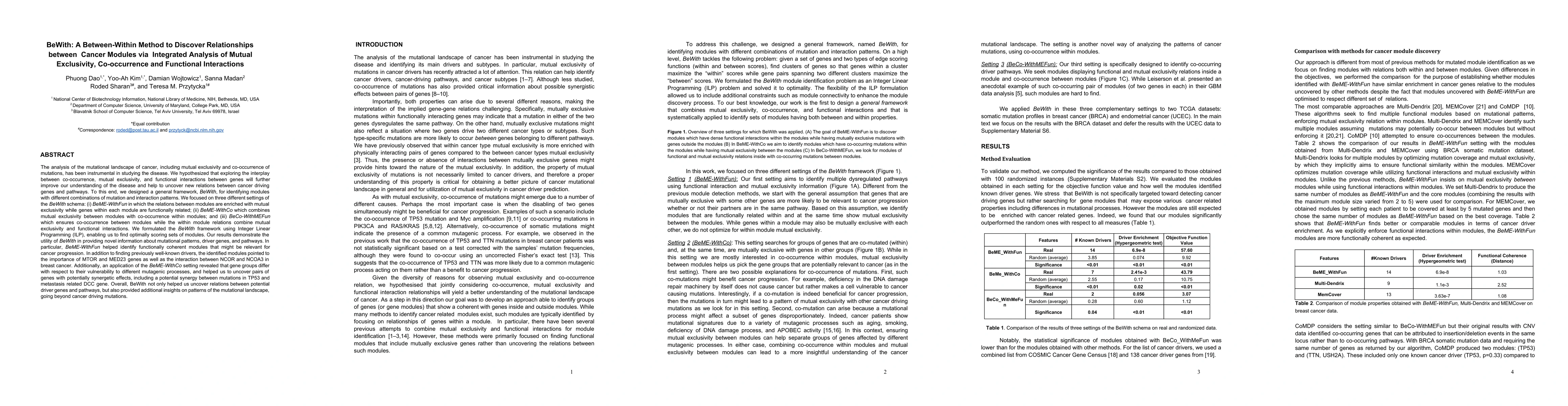 The analysis of the mutational landscape of cancer, including mutual exclusivity and co-occurrence of mutations, has been instrumental in studying the disease. We hypothesized that exploring the interplay between co-occurrence, mutual exclusivity, and functional interactions between genes will further improve our understanding of the disease and help to uncover new relations between cancer driving genes and pathways. To this end, we designed a general framework, BeWith, for identifying modules with different combinations of mutation and interaction patterns. We focused on three different settings of the BeWith schema: (i) BeME-WithFun in which the relations between modules are enriched with mutual exclusivity while genes within each module are functionally related; (ii) BeME-WithCo which combines mutual exclusivity between modules with co-occurrence within modules; and (iii) BeCo-WithMEFun which ensures co-occurrence between modules while the within module relations combine mutual exclusivity and functional interactions. We formulated the BeWith framework using Integer Linear Programming (ILP), enabling us to find optimally scoring sets of modules. Our results demonstrate the utility of BeWith in providing novel information about mutational patterns, driver genes, and pathways. In particular, BeME-WithFun helped identify functionally coherent modules that might be relevant for cancer progression. In addition to finding previously well-known drivers, the identified modules pointed to the importance of the interaction between NCOR and NCOA3 in breast cancer. Additionally, an application of the BeME-WithCo setting revealed that gene groups differ with respect to their vulnerability to different mutagenic processes, and helped us to uncover pairs of genes with potentially synergetic effects, including a potential synergy between mutations in TP53 and metastasis related DCC gene.