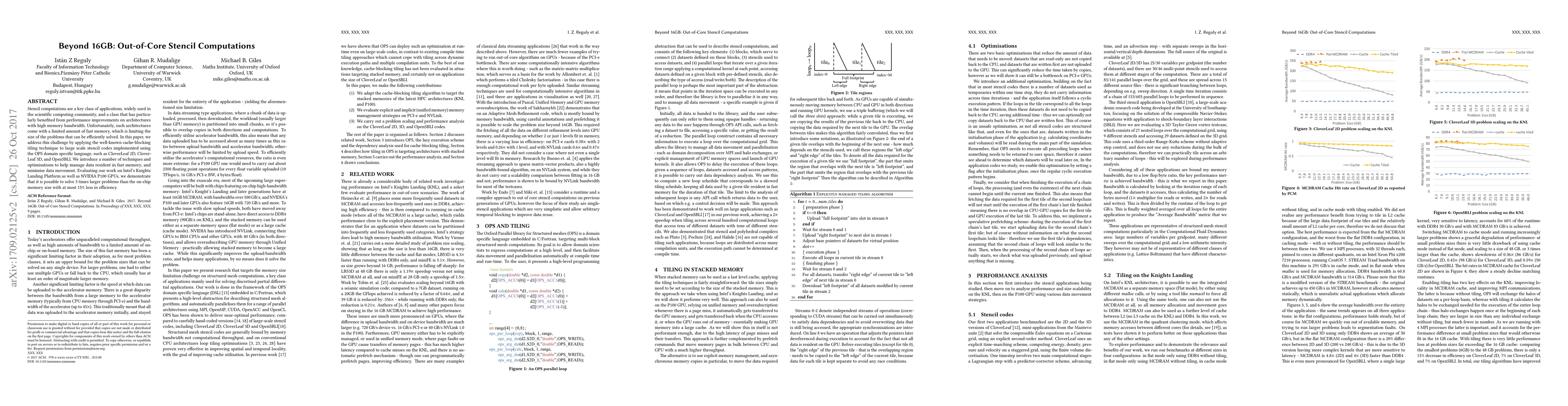 Stencil computations are a key class of applications, widely used in the scientific computing community, and a class that has particularly benefited from performance improvements on architectures with high memory bandwidth. Unfortunately, such architectures come with a limited amount of fast memory, which is limiting the size of the problems that can be efficiently solved. In this paper, we address this challenge by applying the well-known cache-blocking tiling technique to large scale stencil codes implemented using the OPS domain specific language, such as CloverLeaf 2D, CloverLeaf 3D, and OpenSBLI. We introduce a number of techniques and optimisations to help manage data resident in fast memory, and minimise data movement. Evaluating our work on Intel's Knights Landing Platform as well as NVIDIA P100 GPUs, we demonstrate that it is possible to solve 3 times larger problems than the on-chip memory size with at most 15\% loss in efficiency