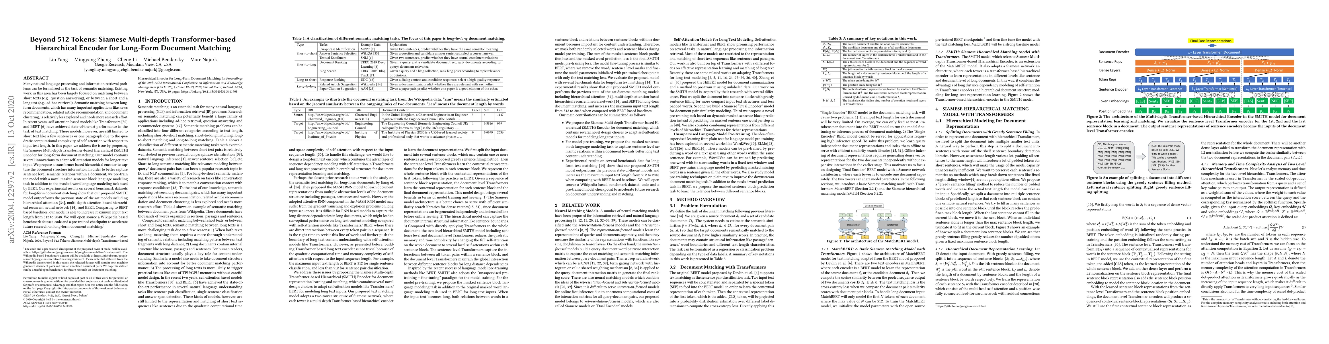 This paper proposes the Siamese Multi-depth Transformer-based Hierarchical (SMITH) Encoder to improve long-form document matching, addressing the limitations of existing self-attention models like BERT. The SMITH model enhances performance by pre-training with a novel masked sentence block language modeling task and extends the maximum input text length from 512 to 2048 tokens, outperforming previous state-of-the-art models on benchmark datasets.