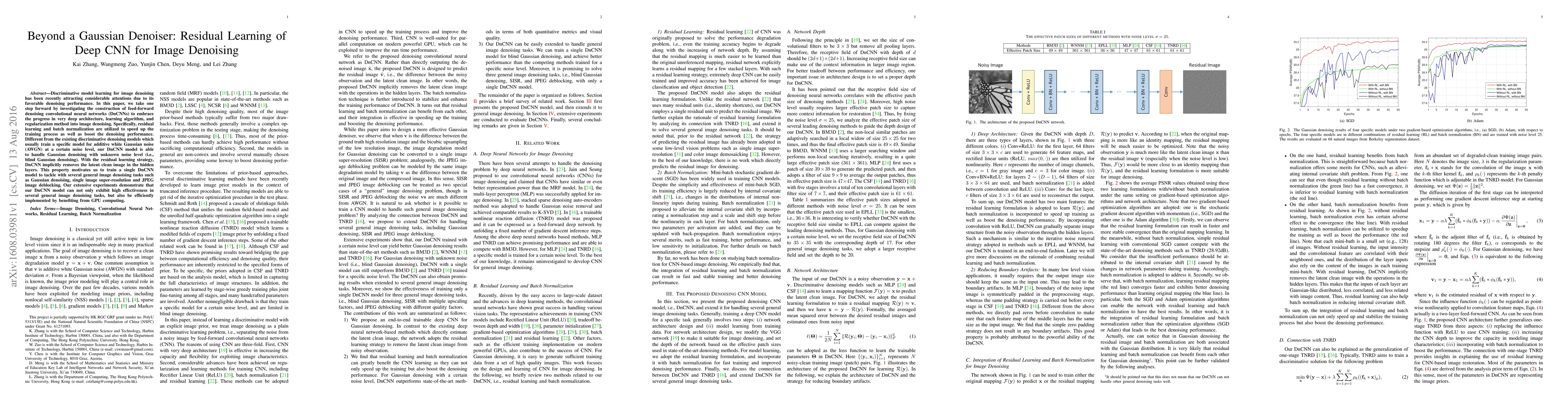 This paper proposes a deep convolutional neural network (DnCNN) with residual learning and batch normalization for image denoising tasks, including blind Gaussian denoising. The model demonstrates high effectiveness across various denoising tasks and benefits from GPU acceleration.