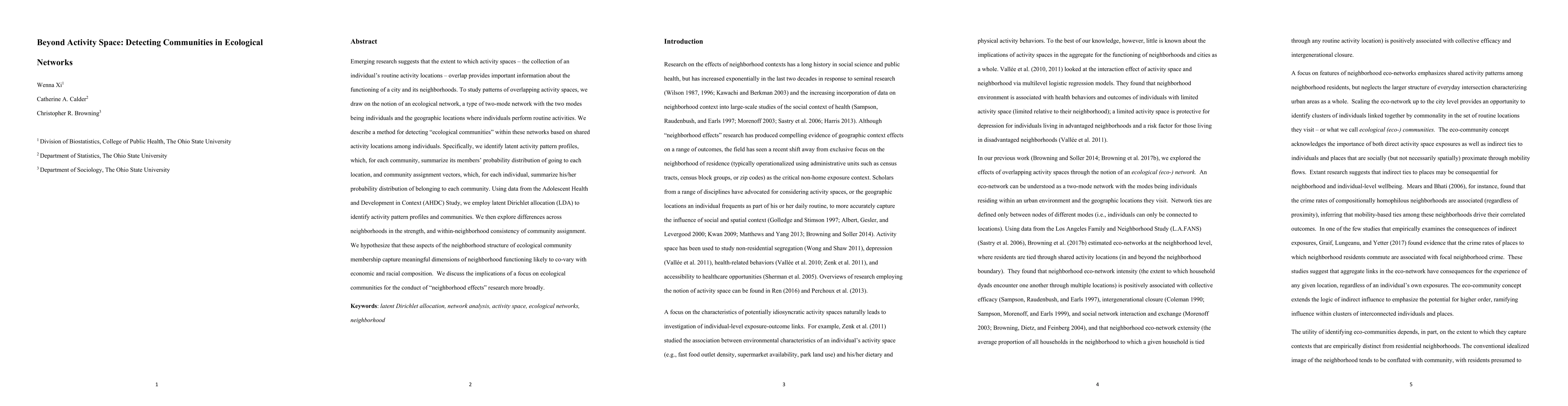 This paper proposes a method for detecting "ecological communities" in networks based on overlapping activity spaces, using the Adolescent Health and Development in Context (AHDC) Study data. The study employs latent Dirichlet allocation to identify activity patterns and community assignments, exploring how these relate to neighborhood functioning and economic/racial composition.