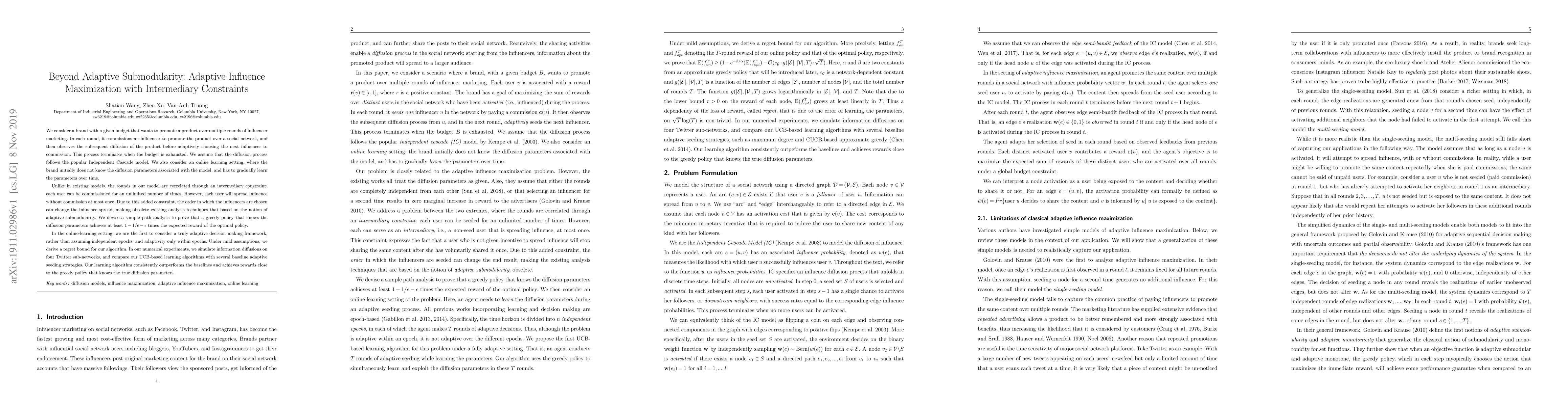 We consider a brand with a given budget that wants to promote a product over multiple rounds of influencer marketing. In each round, it commissions an influencer to promote the product over a social network, and then observes the subsequent diffusion of the product before adaptively choosing the next influencer to commission. This process terminates when the budget is exhausted. We assume that the diffusion process follows the popular Independent Cascade model. We also consider an online learning setting, where the brand initially does not know the diffusion parameters associated with the model, and has to gradually learn the parameters over time. Unlike in existing models, the rounds in our model are correlated through an intermediary constraint: each user can be commissioned for an unlimited number of times. However, each user will spread influence without commission at most once. Due to this added constraint, the order in which the influencers are chosen can change the influence spread, making obsolete existing analysis techniques that based on the notion of adaptive submodularity. We devise a sample path analysis to prove that a greedy policy that knows the diffusion parameters achieves at least $1-1/e - \epsilon$ times the expected reward of the optimal policy. In the online-learning setting, we are the first to consider a truly adaptive decision making framework, rather than assuming independent epochs, and adaptivity only within epochs. Under mild assumptions, we derive a regret bound for our algorithm. In our numerical experiments, we simulate information diffusions on four Twitter sub-networks, and compare our UCB-based learning algorithms with several baseline adaptive seeding strategies. Our learning algorithm consistently outperforms the baselines and achieves rewards close to the greedy policy that knows the true diffusion parameters.