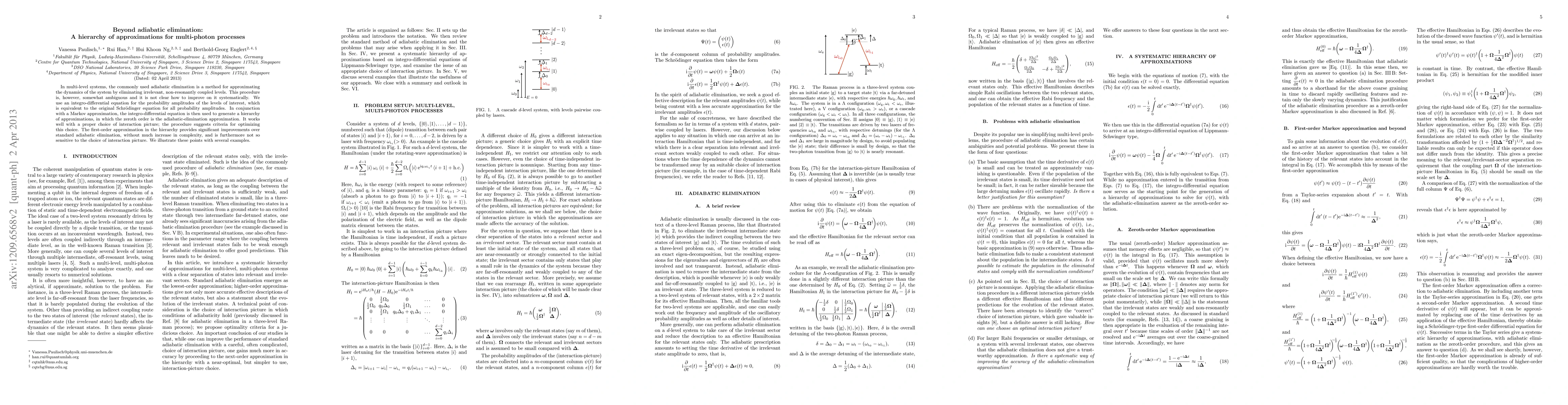 This paper proposes a new hierarchy of approximations for multi-photon processes beyond adiabatic elimination, using an integro-differential equation for probability amplitudes. The first-order approximation in this hierarchy offers significant improvements over standard adiabatic elimination with minimal additional complexity.