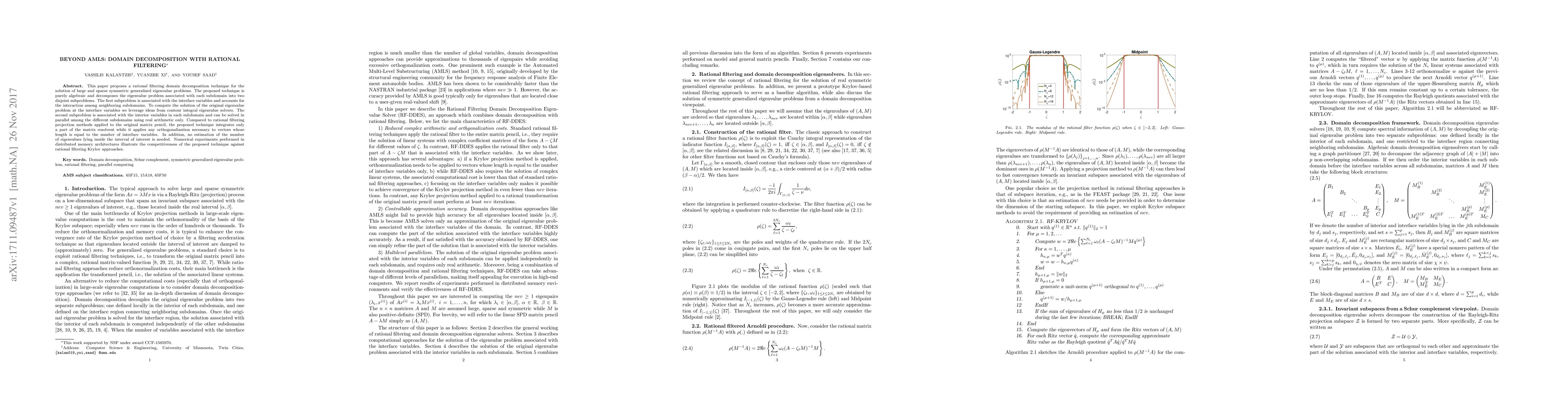 This paper proposes a rational filtering domain decomposition technique for the solution of large and sparse symmetric generalized eigenvalue problems. The proposed technique is purely algebraic and decomposes the eigenvalue problem associated with each subdomain into two disjoint subproblems. The first subproblem is associated with the interface variables and accounts for the interaction among neighboring subdomains. To compute the solution of the original eigenvalue problem at the interface variables we leverage ideas from contour integral eigenvalue solvers. The second subproblem is associated with the interior variables in each subdomain and can be solved in parallel among the different subdomains using real arithmetic only. Compared to rational filtering projection methods applied to the original matrix pencil, the proposed technique integrates only a part of the matrix resolvent while it applies any orthogonalization necessary to vectors whose length is equal to the number of interface variables. In addition, no estimation of the number of eigenvalues lying inside the interval of interest is needed. Numerical experiments performed in distributed memory architectures illustrate the competitiveness of the proposed technique against rational filtering Krylov approaches.