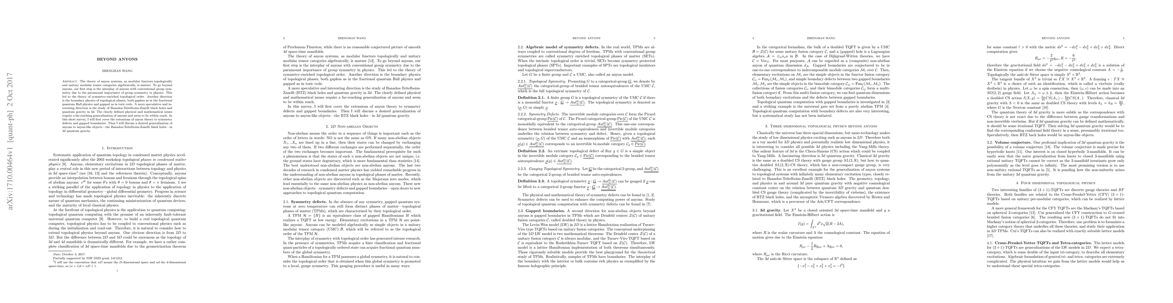 This paper explores ways to extend the theory of anyons beyond their current limits, including studying symmetry-enriched topological order, boundary physics, and quantum gravity in 3D. It aims to generalize anyon theory to accommodate new physical and mathematical issues related to Banados-Teitelboim-Zanelli black holes.