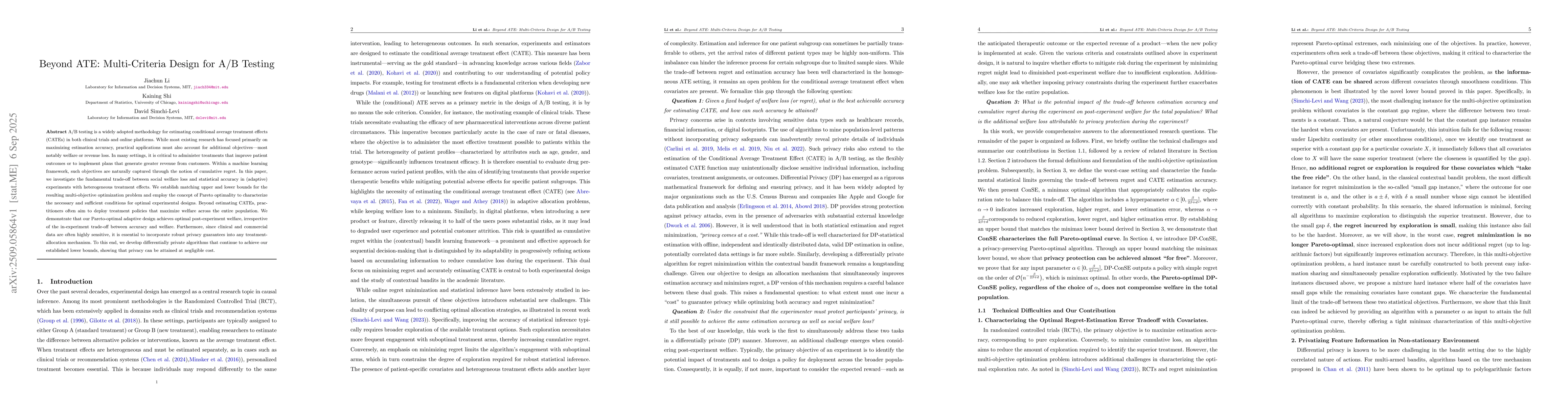 A/B testing is a widely adopted methodology for estimating conditional average treatment effects (CATEs) in both clinical trials and online platforms. While most existing research has focused primarily on maximizing estimation accuracy, practical applications must also account for additional objectives-most notably welfare or revenue loss. In many settings, it is critical to administer treatments that improve patient outcomes or to implement plans that generate greater revenue from customers. Within a machine learning framework, such objectives are naturally captured through the notion of cumulative regret. In this paper, we investigate the fundamental trade-off between social welfare loss and statistical accuracy in (adaptive) experiments with heterogeneous treatment effects. We establish matching upper and lower bounds for the resulting multi-objective optimization problem and employ the concept of Pareto optimality to characterize the necessary and sufficient conditions for optimal experimental designs. Beyond estimating CATEs, practitioners often aim to deploy treatment policies that maximize welfare across the entire population. We demonstrate that our Pareto-optimal adaptive design achieves optimal post-experiment welfare, irrespective of the in-experiment trade-off between accuracy and welfare. Furthermore, since clinical and commercial data are often highly sensitive, it is essential to incorporate robust privacy guarantees into any treatment-allocation mechanism. To this end, we develop differentially private algorithms that continue to achieve our established lower bounds, showing that privacy can be attained at negligible cost.
