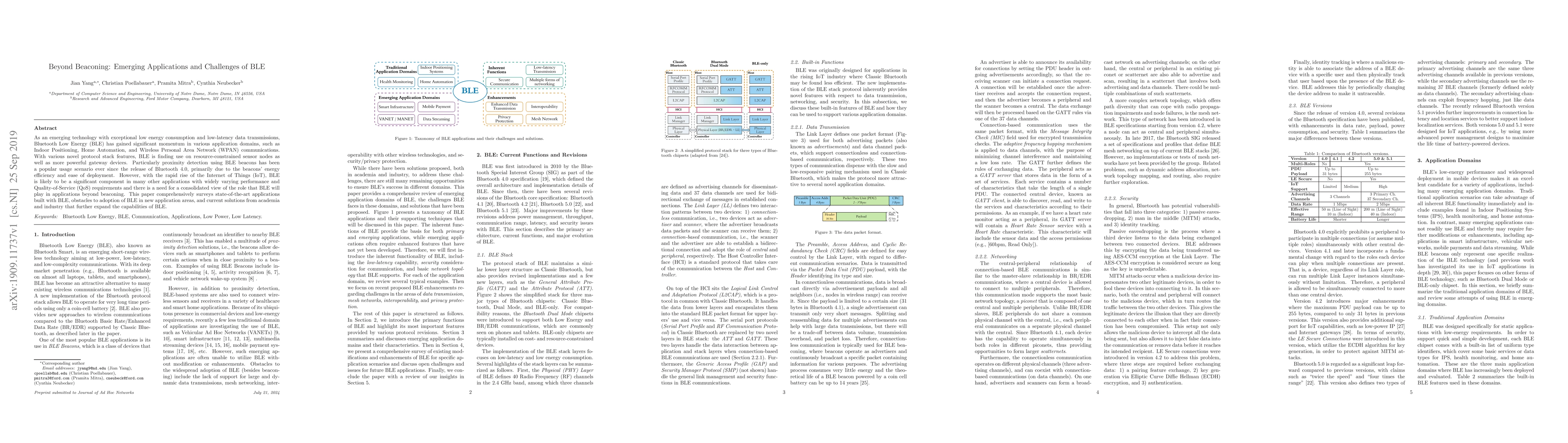 This paper surveys the expanding applications of Bluetooth Low Energy (BLE) beyond beaconing, including Indoor Positioning and Home Automation, and discusses the challenges and solutions in adopting BLE for diverse IoT applications. It highlights the technology's potential and obstacles in meeting varied performance and QoS requirements.