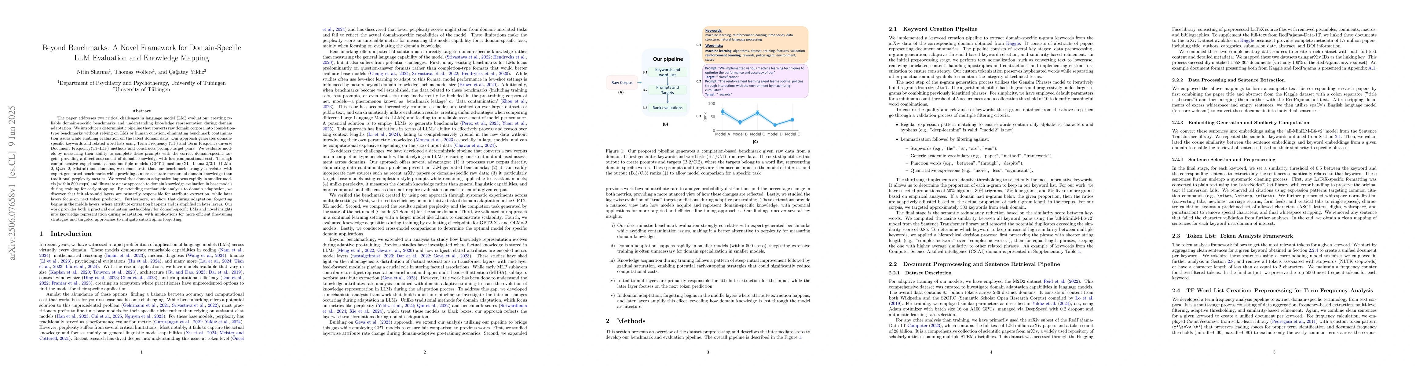 The paper presents a novel framework for domain-specific language model evaluation, eliminating contamination issues in benchmarks. It introduces a deterministic pipeline using TF and Term TF-IDF methods to generate domain-specific completion-type tasks. Experiments show this method correlates well with expert benchmarks and accurately measures domain knowledge, revealing domain adaptation dynamics in various models. It also uncovers layer-wise responsibilities during adaptation, suggesting efficient fine-tuning strategies and methods to combat forgetting.