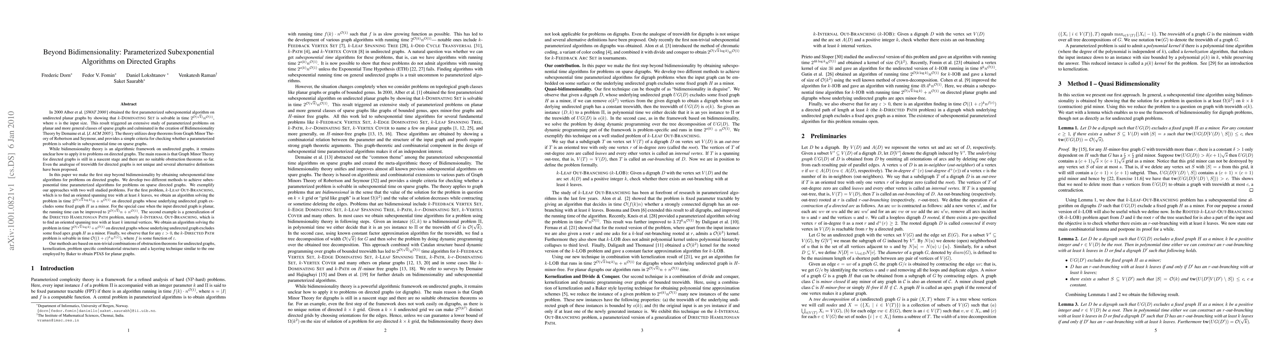 We develop two different methods to achieve subexponential time parameterized algorithms for problems on sparse directed graphs. We exemplify our approaches with two well studied problems. For the first problem, {\sc $k$-Leaf Out-Branching}, which is to find an oriented spanning tree with at least $k$ leaves, we obtain an algorithm solving the problem in time $2^{O(\sqrt{k} \log k)} n+ n^{O(1)}$ on directed graphs whose underlying undirected graph excludes some fixed graph $H$ as a minor. For the special case when the input directed graph is planar, the running time can be improved to $2^{O(\sqrt{k})}n + n^{O(1)}$. The second example is a generalization of the {\sc Directed Hamiltonian Path} problem, namely {\sc $k$-Internal Out-Branching}, which is to find an oriented spanning tree with at least $k$ internal vertices. We obtain an algorithm solving the problem in time $2^{O(\sqrt{k} \log k)} + n^{O(1)}$ on directed graphs whose underlying undirected graph excludes some fixed apex graph $H$ as a minor. Finally, we observe that for any $\epsilon>0$, the {\sc $k$-Directed Path} problem is solvable in time $O((1+\epsilon)^k n^{f(\epsilon)})$, where $f$ is some function of $\ve$. Our methods are based on non-trivial combinations of obstruction theorems for undirected graphs, kernelization, problem specific combinatorial structures and a layering technique similar to the one employed by Baker to obtain PTAS for planar graphs.