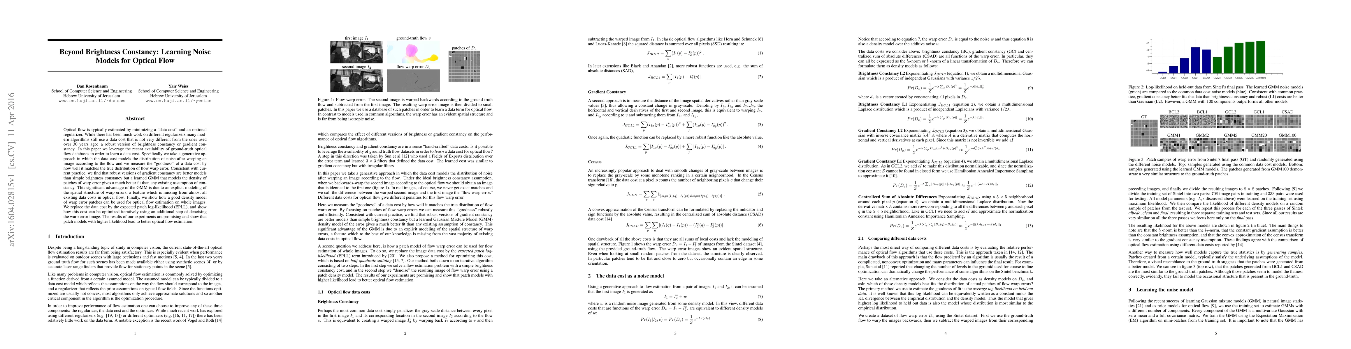 This paper proposes learning a data cost for optical flow estimation, moving beyond traditional brightness or gradient constancy models. By leveraging ground-truth databases, it introduces a generative approach using a Gaussian Mixture Model (GMM) to better capture the spatial structure of warp errors, leading to improved optical flow estimation when integrated into an iterative optimization process involving denoising.