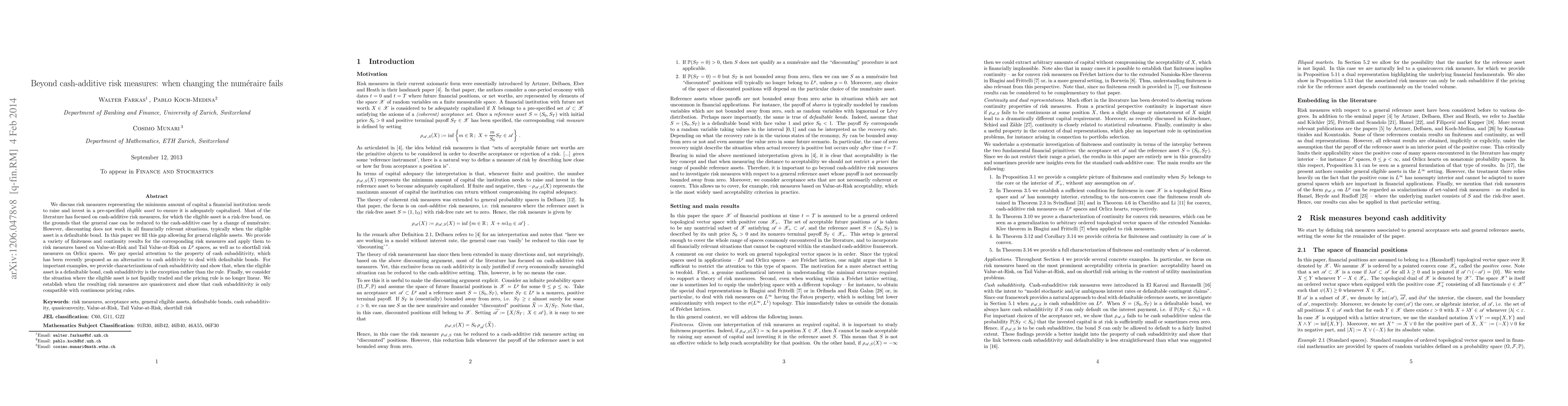 This paper explores risk measures beyond cash-additive approaches, particularly when changing the numeraire fails, especially for defaultable bonds. It provides finiteness and continuity results for risk measures based on Value-at-Risk and Tail Value-at-Risk, and discusses the property of cash subadditivity, showing it is rare for defaultable bonds.