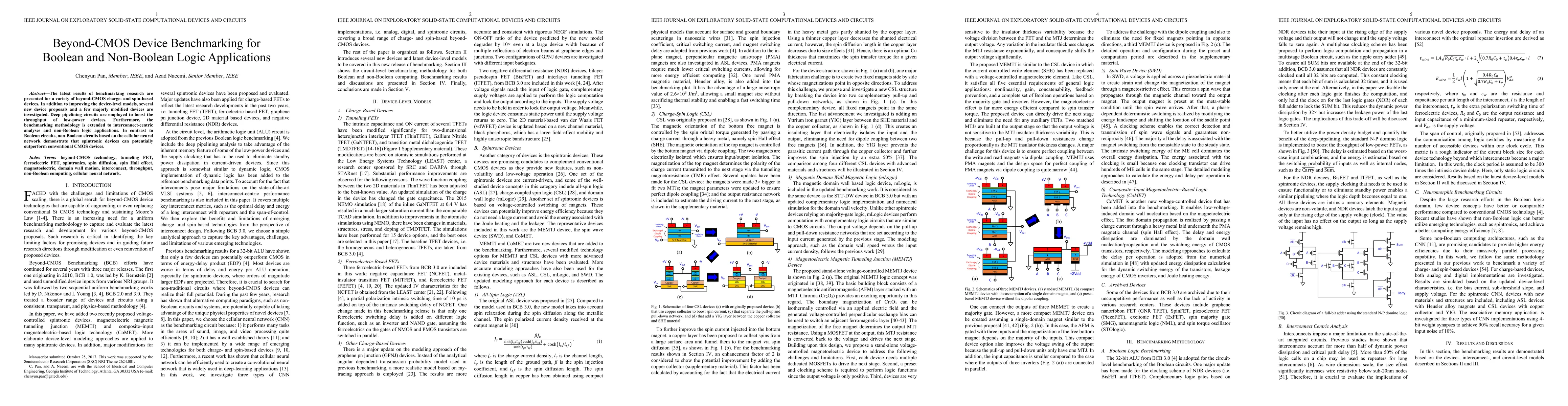 The latest results of benchmarking research are presented for a variety of beyond-CMOS charge- and spin-based devices. In addition to improving the device-level models, several new device proposals and a few majorly modified devices are investigated. Deep pipelining circuits are employed to boost the throughput of low-power devices. Furthermore, the benchmarking methodology is extended to interconnect-centric analyses and non-Boolean logic applications. In contrast to Boolean circuits, non-Boolean circuits based on the cellular neural network demonstrate that spintronic devices can potentially outperform conventional CMOS devices.
