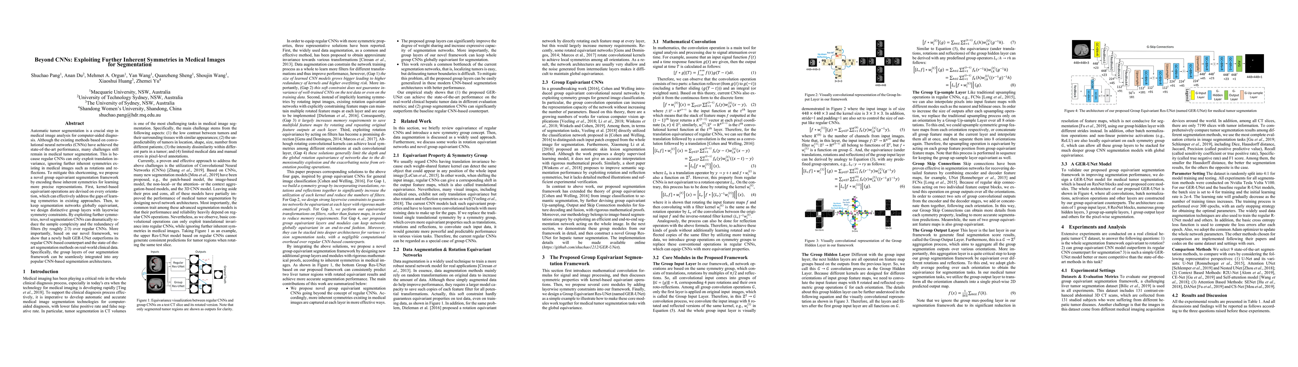 Automatic tumor segmentation is a crucial step in medical image analysis for computer-aided diagnosis. Although the existing methods based on convolutional neural networks (CNNs) have achieved the state-of-the-art performance, many challenges still remain in medical tumor segmentation. This is because regular CNNs can only exploit translation invariance, ignoring further inherent symmetries existing in medical images such as rotations and reflections. To mitigate this shortcoming, we propose a novel group equivariant segmentation framework by encoding those inherent symmetries for learning more precise representations. First, kernel-based equivariant operations are devised on every orientation, which can effectively address the gaps of learning symmetries in existing approaches. Then, to keep segmentation networks globally equivariant, we design distinctive group layers with layerwise symmetry constraints. By exploiting further symmetries, novel segmentation CNNs can dramatically reduce the sample complexity and the redundancy of filters (by roughly 2/3) over regular CNNs. More importantly, based on our novel framework, we show that a newly built GER-UNet outperforms its regular CNN-based counterpart and the state-of-the-art segmentation methods on real-world clinical data. Specifically, the group layers of our segmentation framework can be seamlessly integrated into any popular CNN-based segmentation architectures.