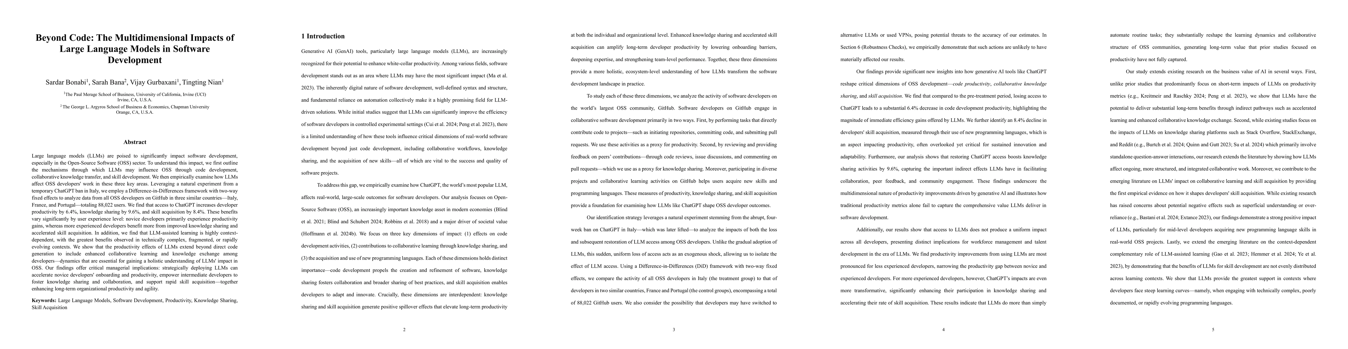 Large language models (LLMs) are poised to significantly impact software development, especially in the Open-Source Software (OSS) sector. To understand this impact, we first outline the mechanisms through which LLMs may influence OSS through code development, collaborative knowledge transfer, and skill development. We then empirically examine how LLMs affect OSS developers' work in these three key areas. Leveraging a natural experiment from a temporary ChatGPT ban in Italy, we employ a Difference-in-Differences framework with two-way fixed effects to analyze data from all OSS developers on GitHub in three similar countries, Italy, France, and Portugal, totaling 88,022 users. We find that access to ChatGPT increases developer productivity by 6.4%, knowledge sharing by 9.6%, and skill acquisition by 8.4%. These benefits vary significantly by user experience level: novice developers primarily experience productivity gains, whereas more experienced developers benefit more from improved knowledge sharing and accelerated skill acquisition. In addition, we find that LLM-assisted learning is highly context-dependent, with the greatest benefits observed in technically complex, fragmented, or rapidly evolving contexts. We show that the productivity effects of LLMs extend beyond direct code generation to include enhanced collaborative learning and knowledge exchange among developers, dynamics that are essential for gaining a holistic understanding of LLMs' impact in OSS. Our findings offer critical managerial implications: strategically deploying LLMs can accelerate novice developers' onboarding and productivity, empower intermediate developers to foster knowledge sharing and collaboration, and support rapid skill acquisition, together enhancing long-term organizational productivity and agility.