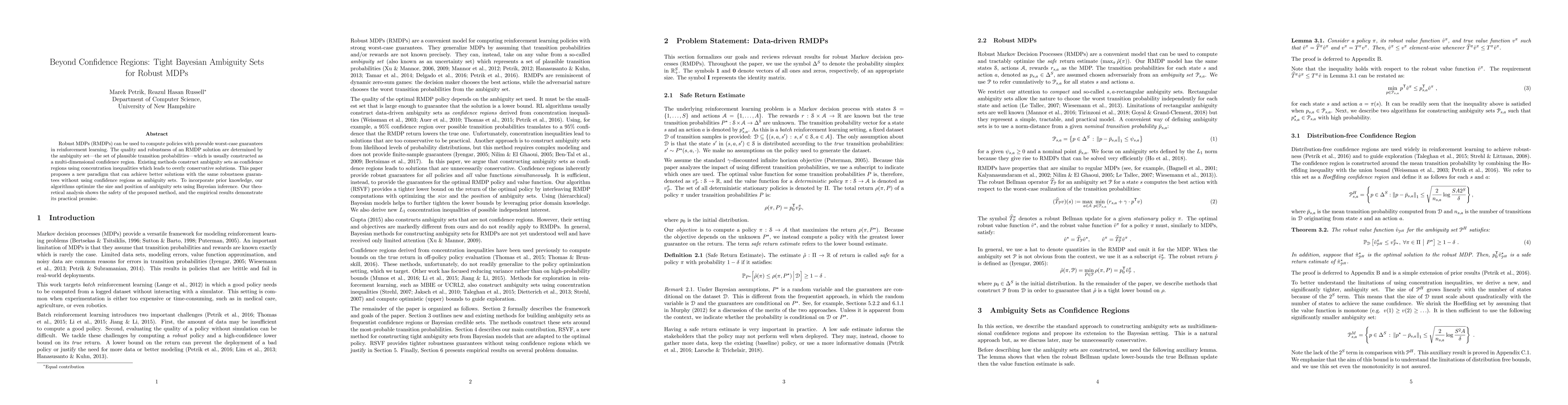 Robust MDPs (RMDPs) can be used to compute policies with provable worst-case guarantees in reinforcement learning. The quality and robustness of an RMDP solution are determined by the ambiguity set---the set of plausible transition probabilities---which is usually constructed as a multi-dimensional confidence region. Existing methods construct ambiguity sets as confidence regions using concentration inequalities which leads to overly conservative solutions. This paper proposes a new paradigm that can achieve better solutions with the same robustness guarantees without using confidence regions as ambiguity sets. To incorporate prior knowledge, our algorithms optimize the size and position of ambiguity sets using Bayesian inference. Our theoretical analysis shows the safety of the proposed method, and the empirical results demonstrate its practical promise.