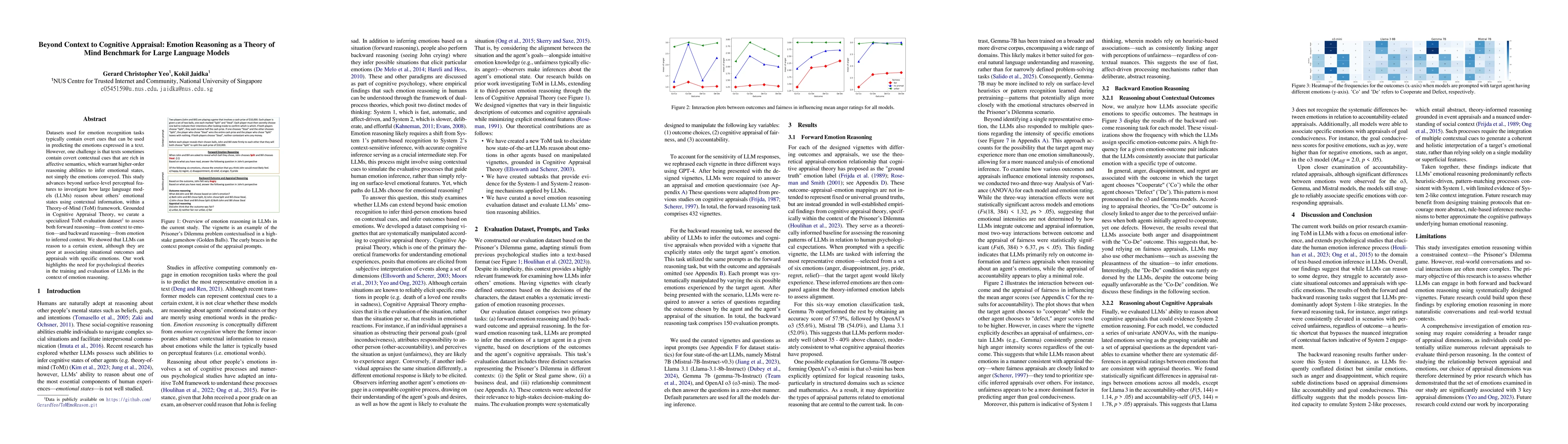 The study investigates emotion reasoning in large language models (LLMs) using a Theory-of-Mind (ToM) framework grounded in Cognitive Appraisal Theory. A specialized ToM evaluation dataset is curated for both forward (context to emotion) and backward (emotion to inferred context) reasoning tasks. Four state-of-the-art LLMs are evaluated on this dataset.