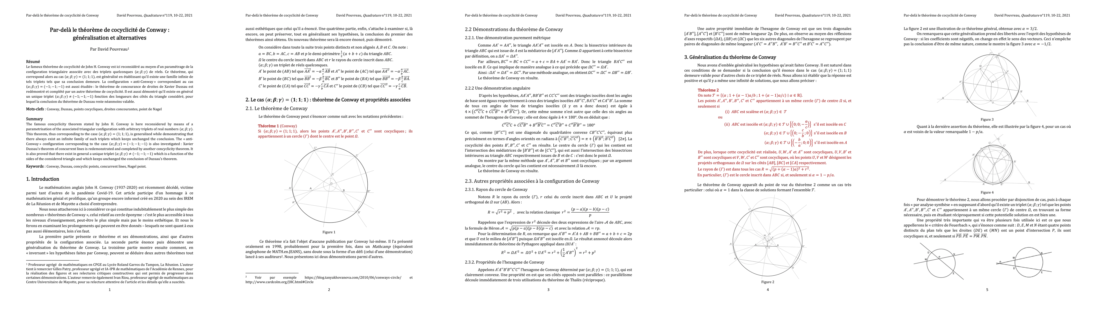 The famous concyclicity theorem stated by John H. Conway is here reconsidered by means of a parametrisation of the associated triangular configuration with arbitrary triplets of real numbers ($\alpha$;$\beta$;$\gamma$). This theorem, thus corresponding to the case ($\alpha$;$\beta$;$\gamma$)=(1;1;1), is generalized while demonstrating that there always exist an infinite family of such triplets which keeps unchanged the conclusion. The "anti-Conway" configuration corresponding to the case ($\alpha$;$\beta$;$\gamma$)=(-1;-1;-1) is also investigated : Xavier Dussau's theorem of concurrent lines is redemonstrated and completed by another concyclicity theorem. It is also proved that there exist in general a unique triplet ($\alpha$;$\beta$;$\gamma$)$\ne$(-1;-1;-1) which is a function of the sides of the considered triangle and which keeps unchanged the conclusion of Dussau's theorem.