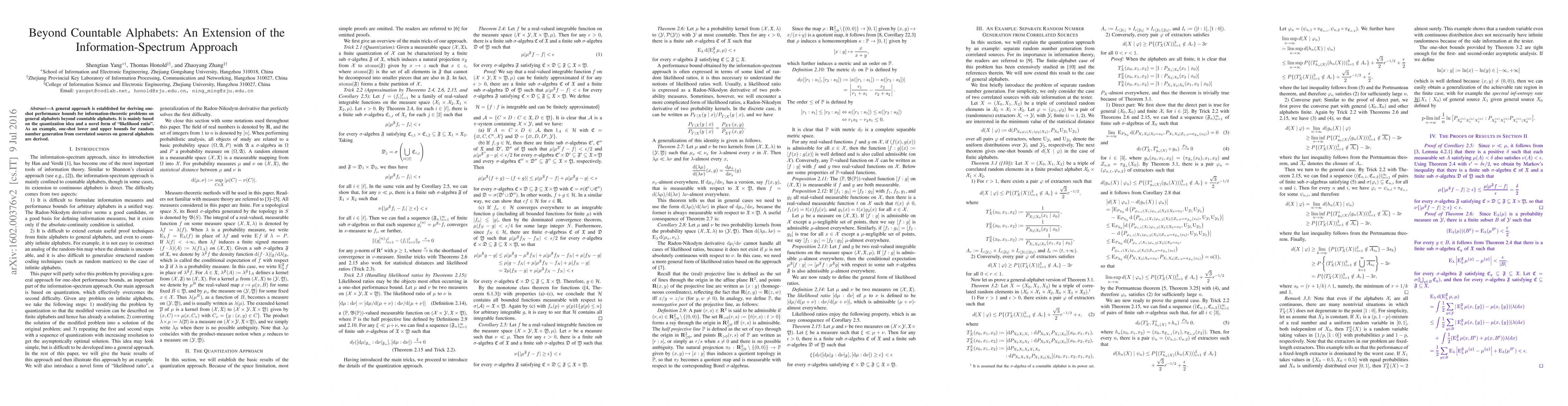 This research introduces a method to derive one-shot performance bounds for information-theoretic problems on any alphabet, not just countable ones. It uses quantization and a new 'likelihood ratio' form, demonstrating its application with one-shot bounds for generating random numbers from correlated sources on general alphabets.