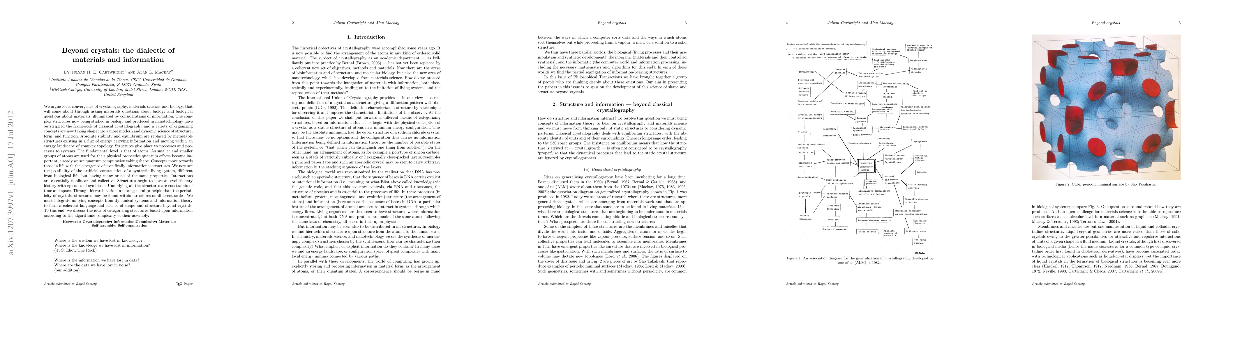 We argue for a convergence of crystallography, materials science and biology, that will come about through asking materials questions about biology and biological questions about materials, illuminated by considerations of information. The complex structures now being studied in biology and produced in nanotechnology have outstripped the framework of classical crystallography, and a variety of organizing concepts are now taking shape into a more modern and dynamic science of structure, form and function. Absolute stability and equilibrium are replaced by metastable structures existing in a flux of energy-carrying information and moving within an energy landscape of complex topology. Structures give place to processes and processes to systems. The fundamental level is that of atoms. As smaller and smaller groups of atoms are used for their physical properties, quantum effects become important; already we see quantum computation taking shape. Concepts move towards those in life with the emergence of specifically informational structures. We now see the possibility of the artificial construction of a synthetic living system, different from biological life, but having many or all of the same properties. Interactions are essentially nonlinear and collective. Structures begin to have an evolutionary history with episodes of symbiosis. Underlying all the structures are constraints of time and space. Through hierarchization, a more general principle than the periodicity of crystals, structures may be found within structures on different scales. We must integrate unifying concepts from dynamical systems and information theory to form a coherent language and science of shape and structure beyond crystals. To this end, we discuss the idea of categorizing structures based on information according to the algorithmic complexity of their assembly.