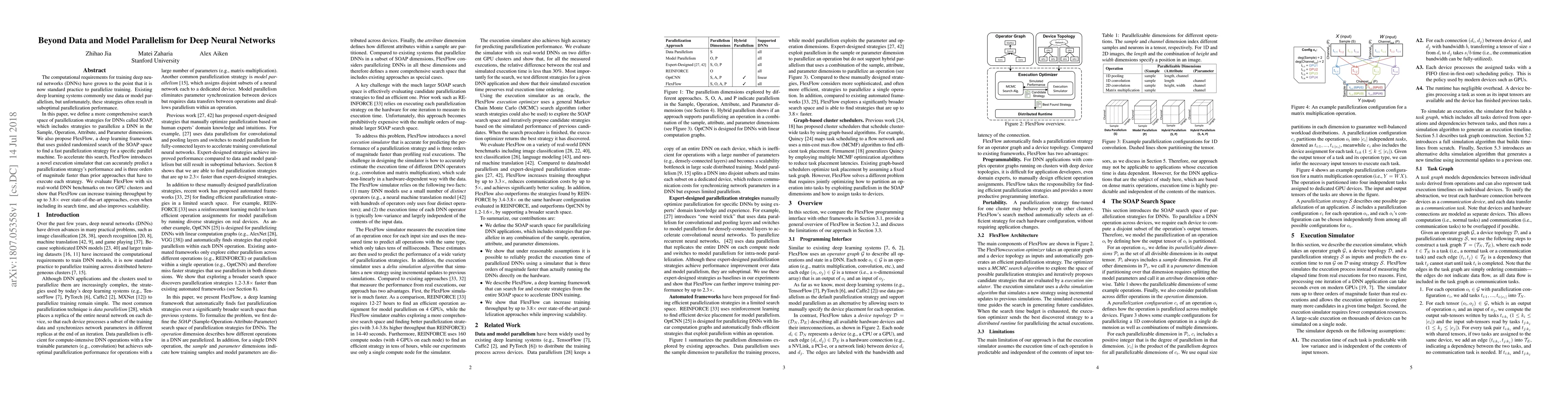 This paper introduces SOAP, a comprehensive parallelization strategy for deep neural networks that encompasses Sample, Operation, Attribute, and Parameter dimensions, and FlexFlow, a framework that uses guided randomized search and a fast execution simulator to optimize parallelization performance, achieving up to 3.8x improvement in training throughput over state-of-the-art methods.
