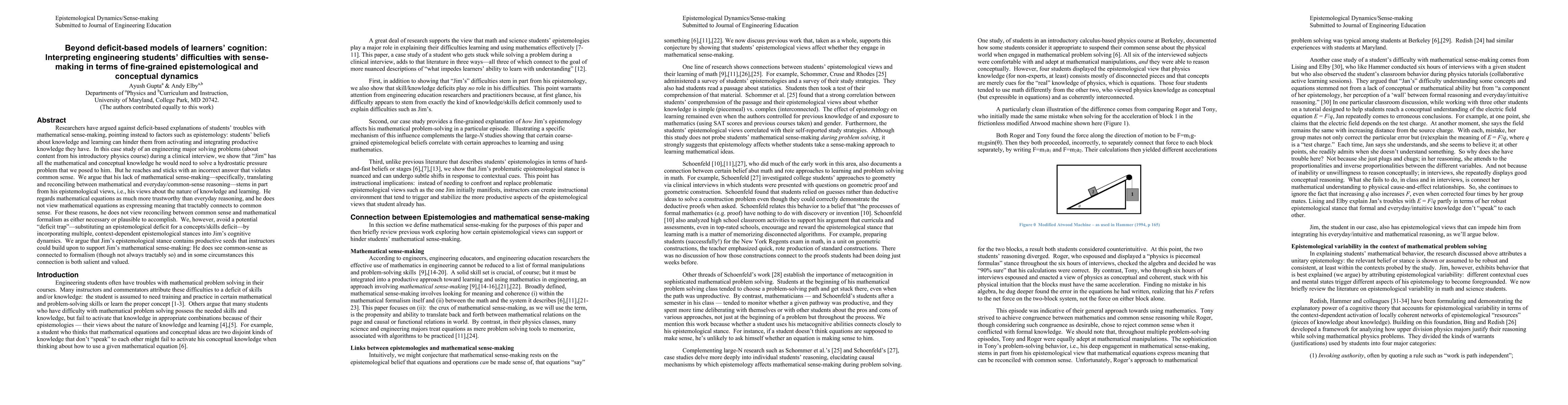 This paper argues against deficit-based explanations of students' difficulties in mathematical sense-making, highlighting instead the role of epistemology. The study shows that an engineering student, "Jim," possesses the necessary knowledge but struggles due to his epistemological beliefs, which prioritize mathematical equations over common sense, thus hindering his ability to reconcile the two. The authors suggest that instructors can leverage Jim's existing epistemological stances to enhance his mathematical sense-making.