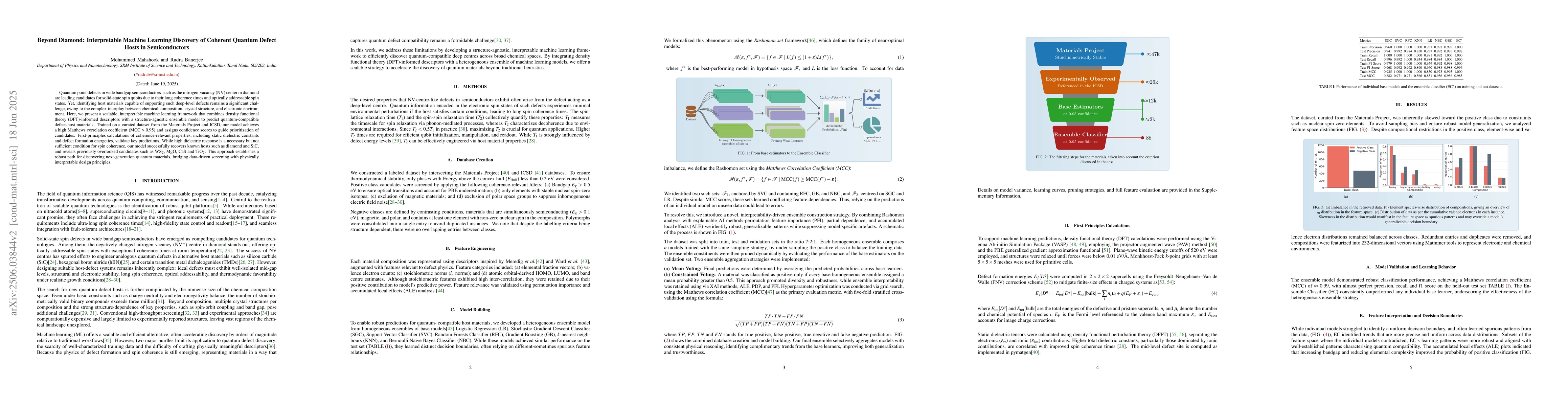 The development of an interpretable machine learning framework that combines DFT-informed descriptors with a structure-agnostic ensemble model for predicting quantum-compatible defect-host materials in wide bandgap semiconductors.