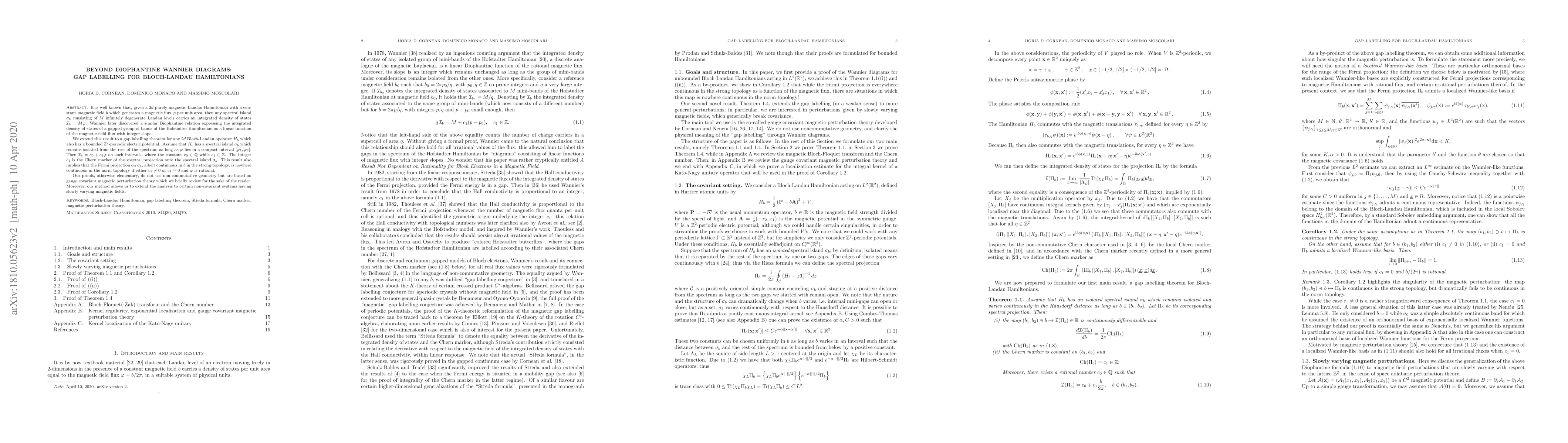 It is well known that, given a $2d$ purely magnetic Landau Hamiltonian with a constant magnetic field $b$ which generates a magnetic flux $\varphi$ per unit area, then any spectral island $\sigma_b$ consisting of $M$ infinitely degenerate Landau levels carries an integrated density of states $\mathcal{I}_b=M \varphi$. Wannier later discovered a similar Diophantine relation expressing the integrated density of states of a gapped group of bands of the Hofstadter Hamiltonian as a linear function of the magnetic field flux with integer slope. We extend this result to a gap labelling theorem for any $2d$ Bloch-Landau operator $H_b$ which also has a bounded $\mathbb{Z}^2$-periodic electric potential. Assume that $H_b$ has a spectral island $\sigma_b$ which remains isolated from the rest of the spectrum as long as $\varphi$ lies in a compact interval $[\varphi_1,\varphi_2]$. Then $\mathcal{I}_b=c_0+c_1\varphi$ on such intervals, where the constant $c_0\in \mathbb{Q}$ while $c_1\in \mathbb{Z}$. The integer $c_1$ is the Chern marker of the spectral projection onto the spectral island $\sigma_b$. This result also implies that the Fermi projection on $\sigma_b$, albeit continuous in $b$ in the strong topology, is nowhere continuous in the norm topology if either $c_1\ne0$ or $c_1=0$ and $\varphi$ is rational. Our proofs, otherwise elementary, do not use non-commutative geometry but are based on gauge covariant magnetic perturbation theory which we briefly review for the sake of the reader. Moreover, our method allows us to extend the analysis to certain non-covariant systems having slowly varying magnetic fields.