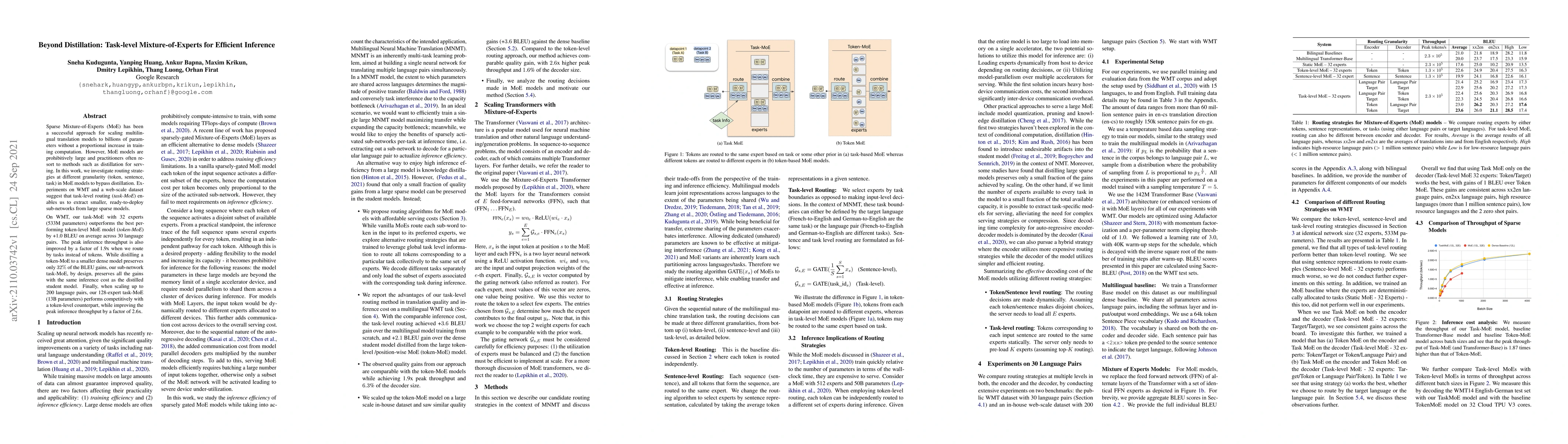 This paper proposes task-level Mixture-of-Experts (task-MoE) to efficiently scale multilingual translation models, bypassing the need for distillation. Task-MoE extracts smaller, ready-to-deploy sub-networks from large sparse models, achieving better performance and higher inference throughput compared to token-level MoE and distilled models.