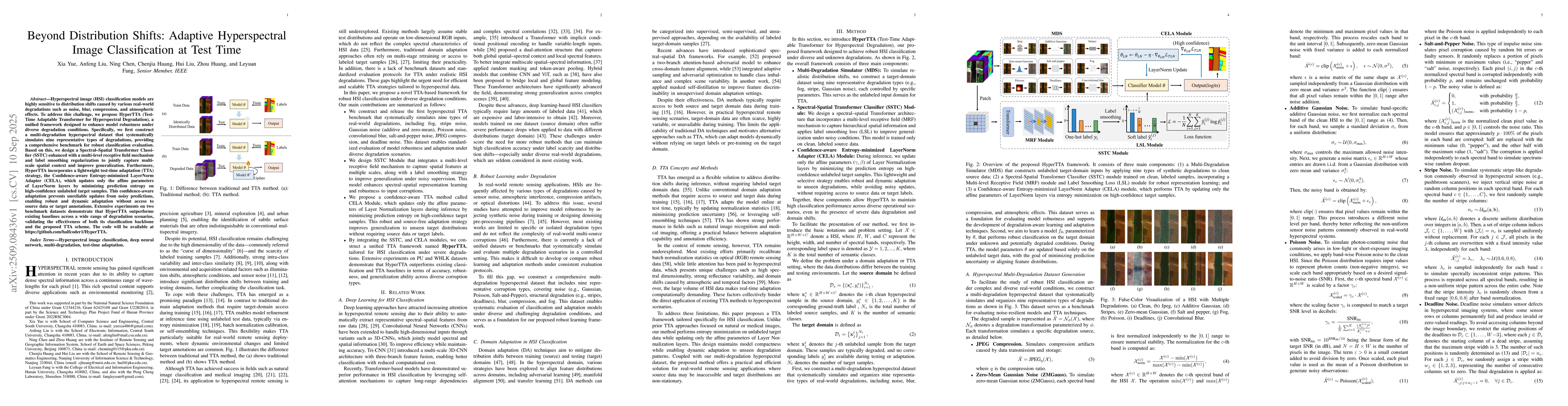 Hyperspectral image (HSI) classification models are highly sensitive to distribution shifts caused by various real-world degradations such as noise, blur, compression, and atmospheric effects. To address this challenge, we propose HyperTTA, a unified framework designed to enhance model robustness under diverse degradation conditions. Specifically, we first construct a multi-degradation hyperspectral dataset that systematically simulates nine representative types of degradations, providing a comprehensive benchmark for robust classification evaluation. Based on this, we design a spectral-spatial transformer classifier (SSTC) enhanced with a multi-level receptive field mechanism and label smoothing regularization to jointly capture multi-scale spatial context and improve generalization. Furthermore, HyperTTA incorporates a lightweight test-time adaptation (TTA) strategy, the confidence-aware entropy-minimized LayerNorm adapter (CELA), which updates only the affine parameters of LayerNorm layers by minimizing prediction entropy on high-confidence unlabeled target samples. This confidence-aware adaptation prevents unreliable updates from noisy predictions, enabling robust and dynamic adaptation without access to source data or target annotations. Extensive experiments on two benchmark datasets demonstrate that HyperTTA outperforms existing baselines across a wide range of degradation scenarios, validating the effectiveness of both its classification backbone and the proposed TTA scheme. Code will be made available publicly.