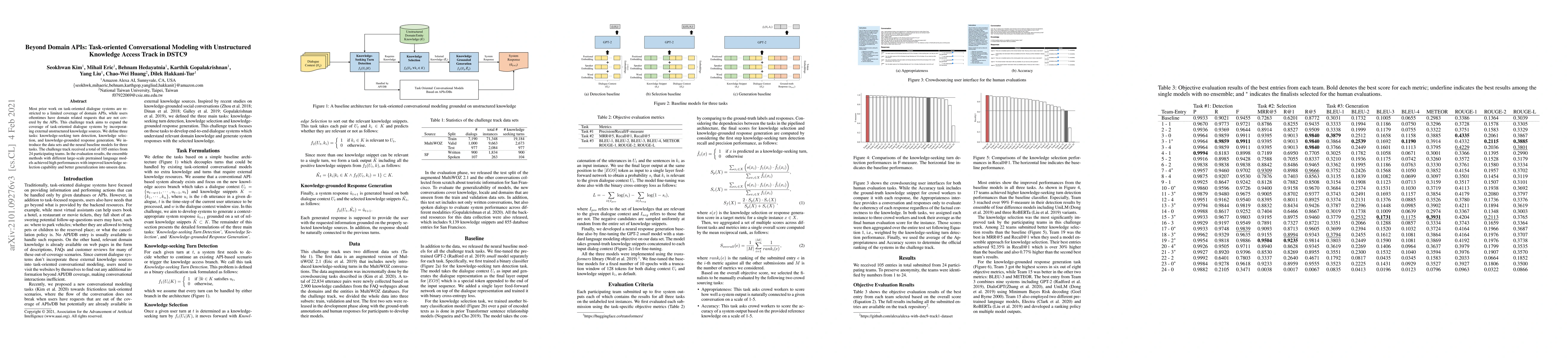 This paper proposes a challenge track to enhance task-oriented dialogue systems by integrating unstructured knowledge sources beyond limited domain APIs. It introduces three tasks: knowledge-seeking turn detection, knowledge selection, and knowledge-grounded response generation, and reports high performance from ensemble methods using large-scale pretrained language models.