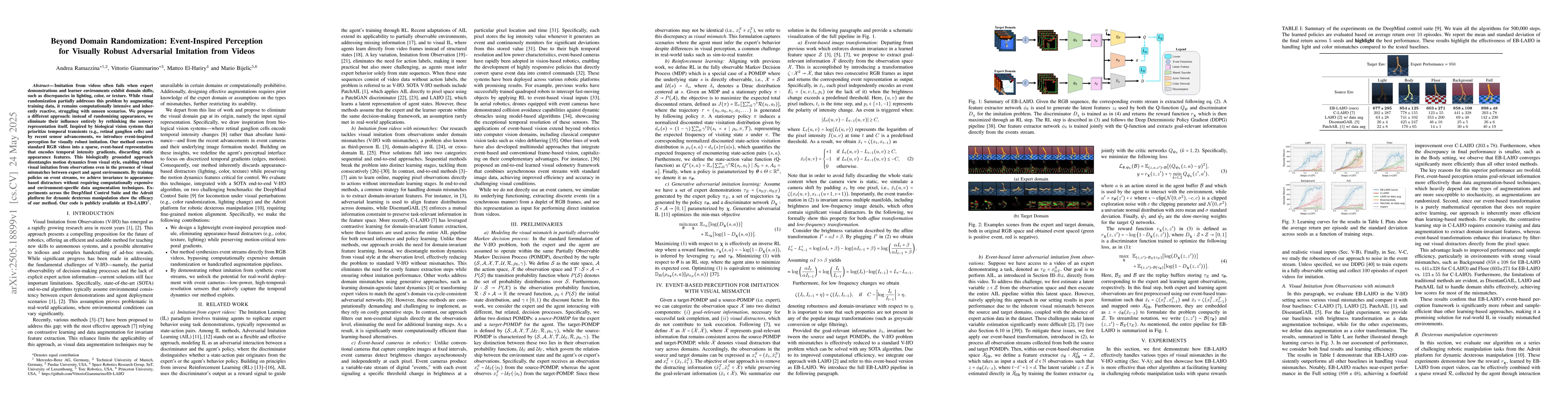 This research introduces event-inspired perception for visually robust imitation from videos, addressing domain shift issues. By converting RGB videos into event-based representations that focus on temporal intensity gradients, it achieves appearance-invariant visual imitation, outperforming traditional methods in various manipulation tasks.
