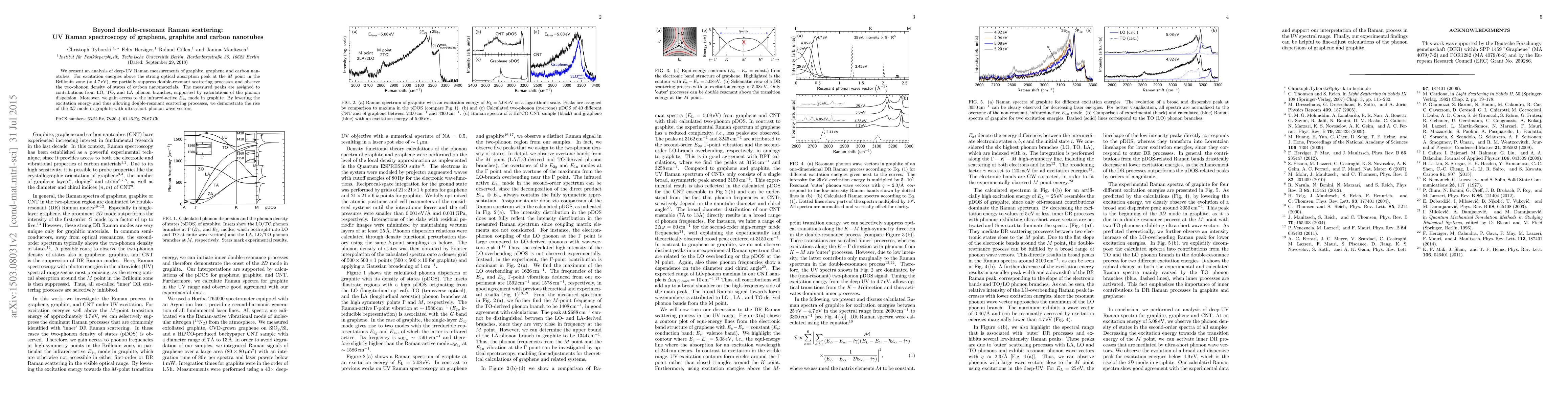We present an analysis of deep-UV Raman measurements of graphite, graphene and carbon nanotubes. For excitation energies above the strong optical absorption peak at the $M$ point in the Brillouin zone ($\approx 4.7\,\text{eV}$), we partially suppress double-resonant scattering processes and observe the two-phonon density of states of carbon nanomaterials. The measured peaks are assigned to contributions from LO, TO, and LA phonon branches, supported by calculations of the phonon dispersion. Moreover, we gain access to the infrared-active $E_{1u}$ mode in graphite. By lowering the excitation energy and thus allowing double-resonant scattering processes, we demonstrate the rise of the \textit{2D} mode in graphite with ultra-short phonon wave vectors.