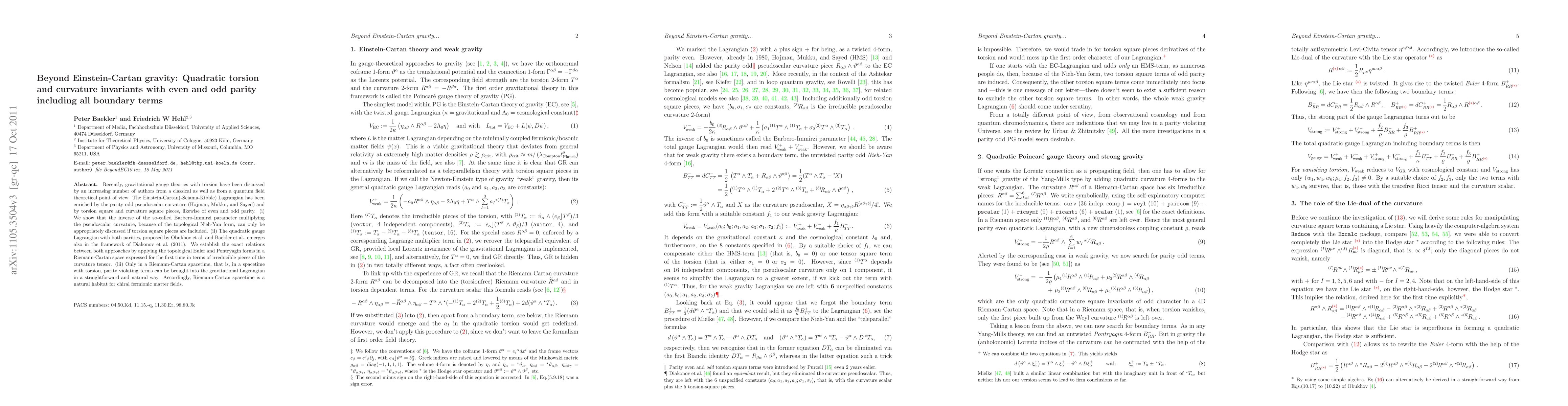 This paper extends the Einstein-Cartan theory by incorporating quadratic invariants of torsion and curvature with both even and odd parity, including all relevant boundary terms. It establishes connections between different formulations of the gauge Lagrangian and highlights the significance of Riemann-Cartan spacetime for chiral fermionic matter fields.