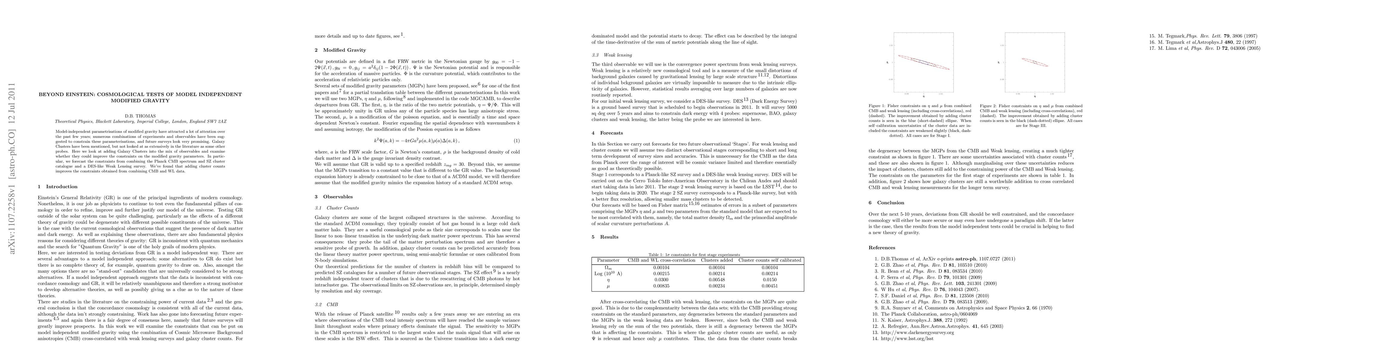 Model-independent parametrisations of modified gravity have attracted a lot of attention over the past few years; numerous combinations of experiments and observables have been suggested to constrain these parameterisations, and future surveys look very promising. Galaxy Clusters have been mentioned, but not looked at as extensively in the literature as some other probes. Here we look at adding Galaxy Clusters into the mix of observables and examine whether they could improve the constraints on the modified gravity parameters. In particular, we forecast the constraints from combining the Planck CMB spectrum and SZ cluster catalogue and a DES-like Weak Lensing survey. We've found that adding cluster counts improves the constraints obtained from combining CMB and WL data.