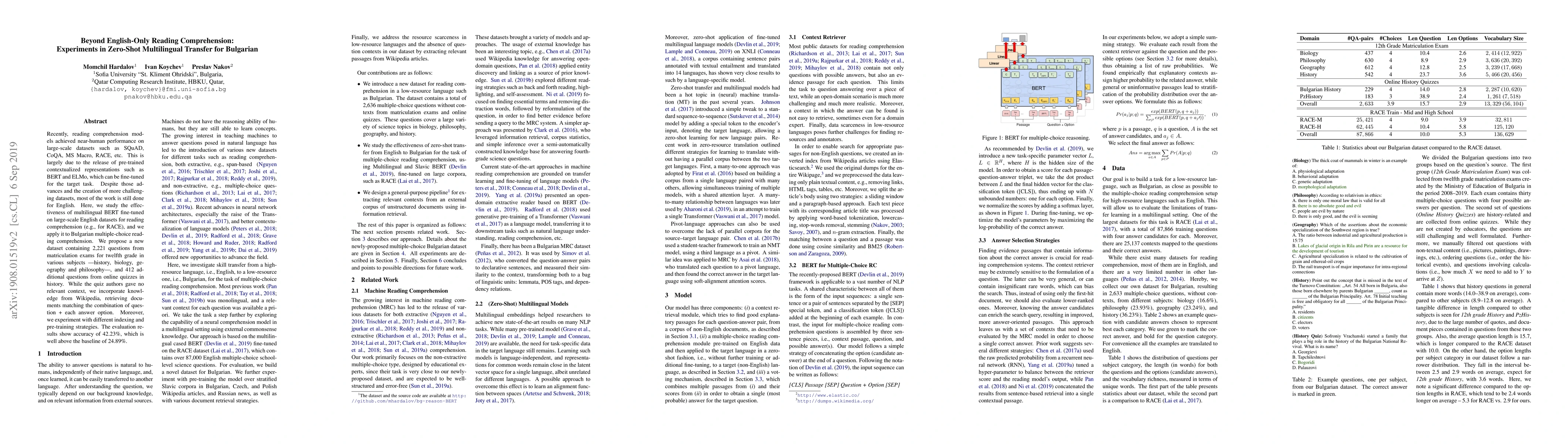 Researchers fine-tuned a multilingual BERT model on English language datasets to improve reading comprehension for Bulgarian language, achieving 42.23% accuracy in multiple-choice questions.