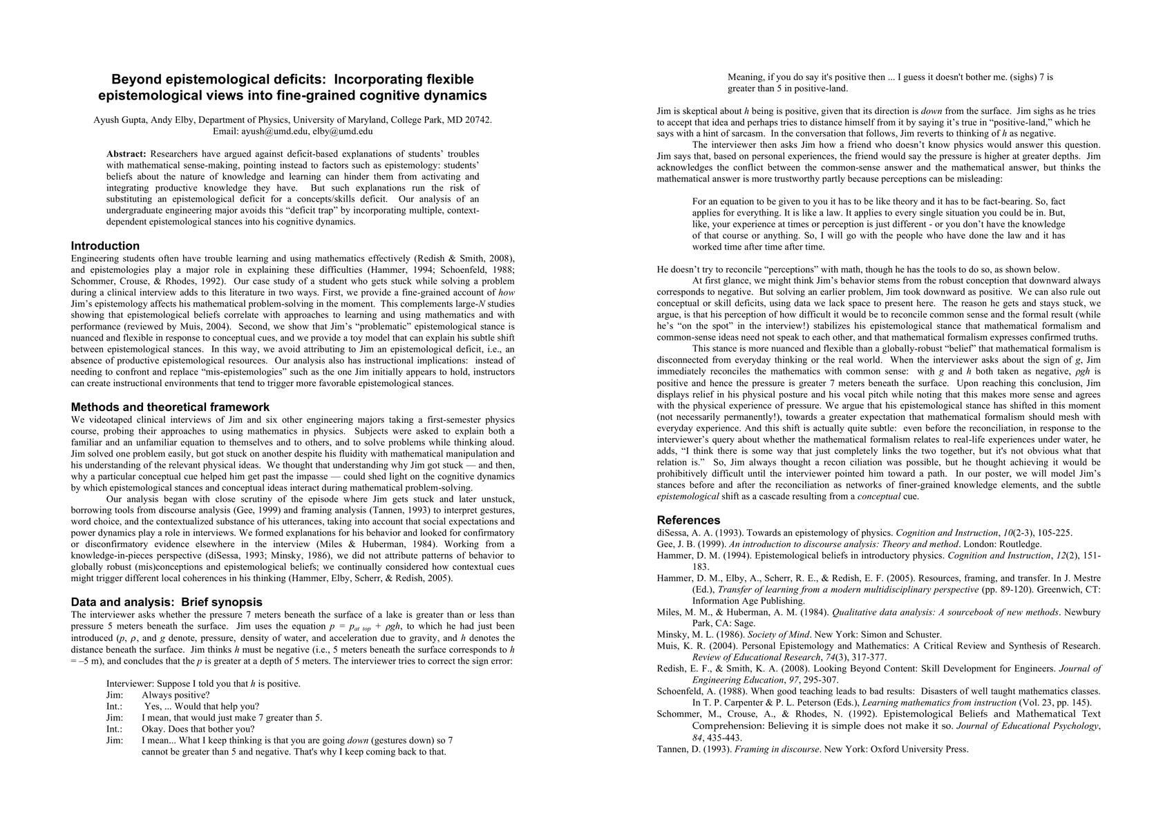This paper critiques deficit-based explanations for students' mathematical difficulties, emphasizing instead that students' epistemological beliefs about knowledge and learning can impede their cognitive processes. It proposes a nuanced approach by integrating flexible epistemological views into the cognitive dynamics of an undergraduate engineering student to avoid the "deficit trap."