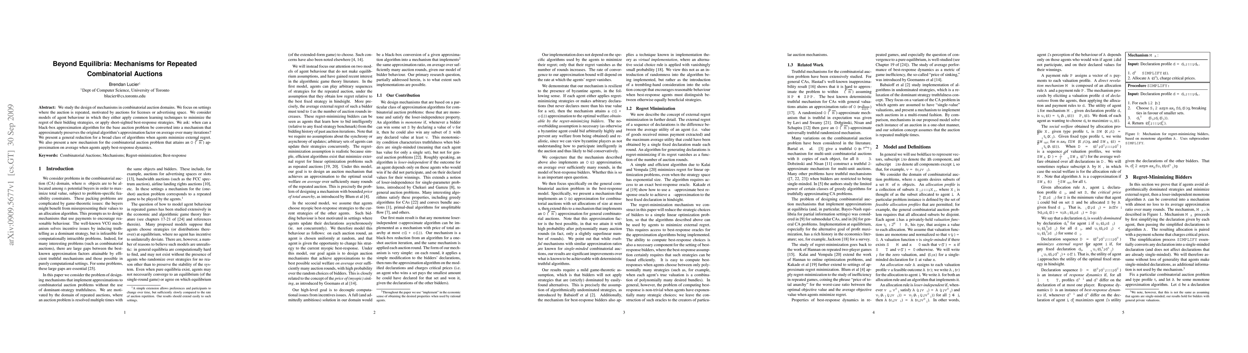 This paper explores mechanisms for repeated combinatorial auctions, examining how black-box approximation algorithms can be adapted to maintain their approximation factor over many iterations. It introduces a new mechanism achieving $O(\sqrt{m})$ approximation when agents use best-response dynamics.
