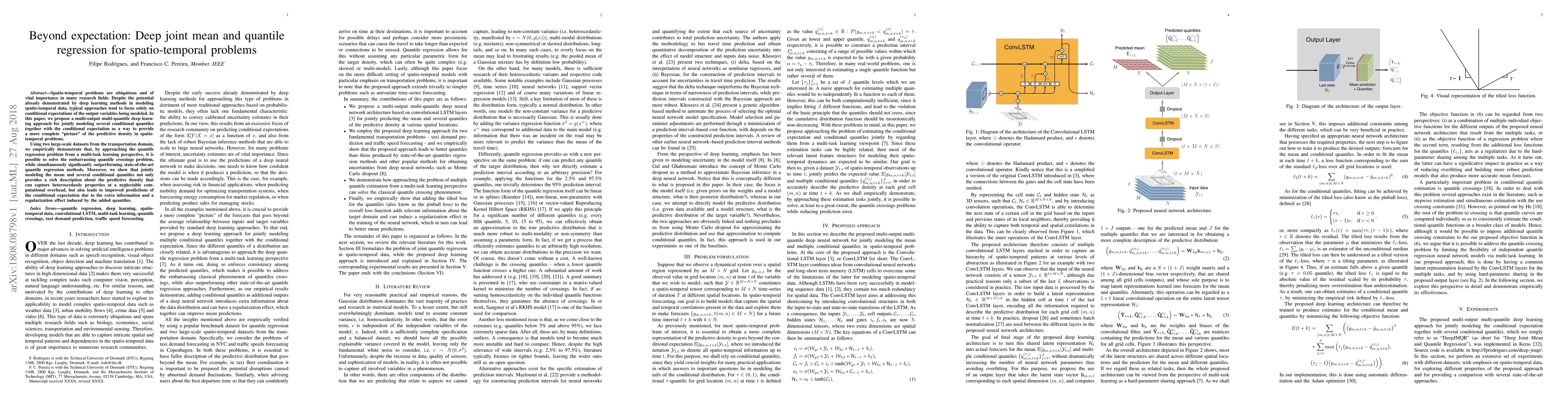 This paper introduces a novel deep learning approach for spatio-temporal problems that jointly models conditional expectations and multiple quantiles. It demonstrates improved performance and solves the quantile crossings problem, providing a richer predictive density description with minimal computational overhead.