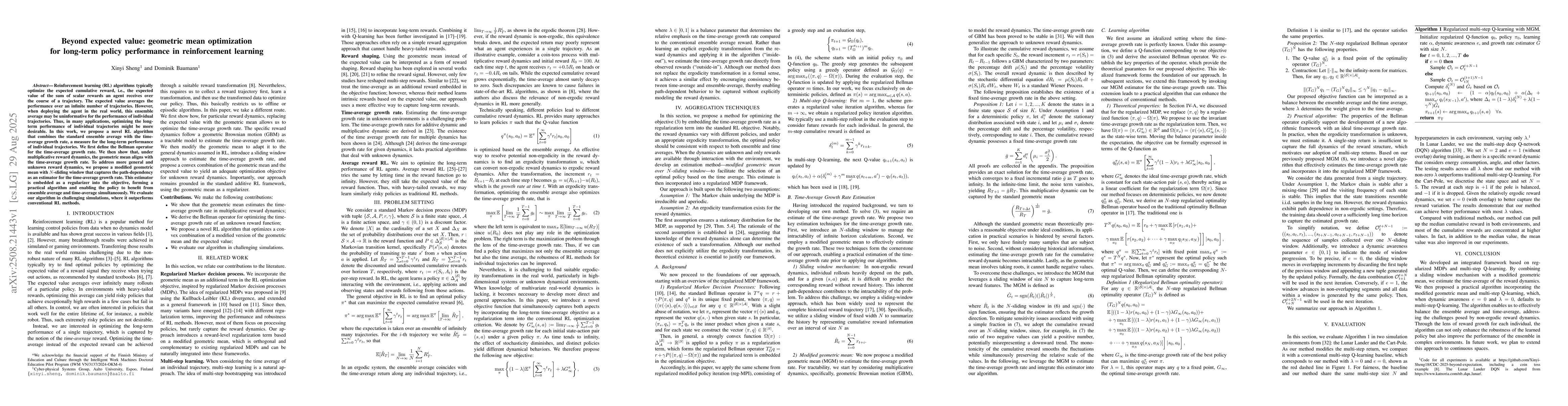 Reinforcement learning (RL) algorithms typically optimize the expected cumulative reward, i.e., the expected value of the sum of scalar rewards an agent receives over the course of a trajectory. The expected value averages the performance over an infinite number of trajectories. However, when deploying the agent in the real world, this ensemble average may be uninformative for the performance of individual trajectories. Thus, in many applications, optimizing the long-term performance of individual trajectories might be more desirable. In this work, we propose a novel RL algorithm that combines the standard ensemble average with the time-average growth rate, a measure for the long-term performance of individual trajectories. We first define the Bellman operator for the time-average growth rate. We then show that, under multiplicative reward dynamics, the geometric mean aligns with the time-average growth rate. To address more general and unknown reward dynamics, we propose a modified geometric mean with $N$-sliding window that captures the path-dependency as an estimator for the time-average growth rate. This estimator is embedded as a regularizer into the objective, forming a practical algorithm and enabling the policy to benefit from ensemble average and time-average simultaneously. We evaluate our algorithm in challenging simulations, where it outperforms conventional RL methods.