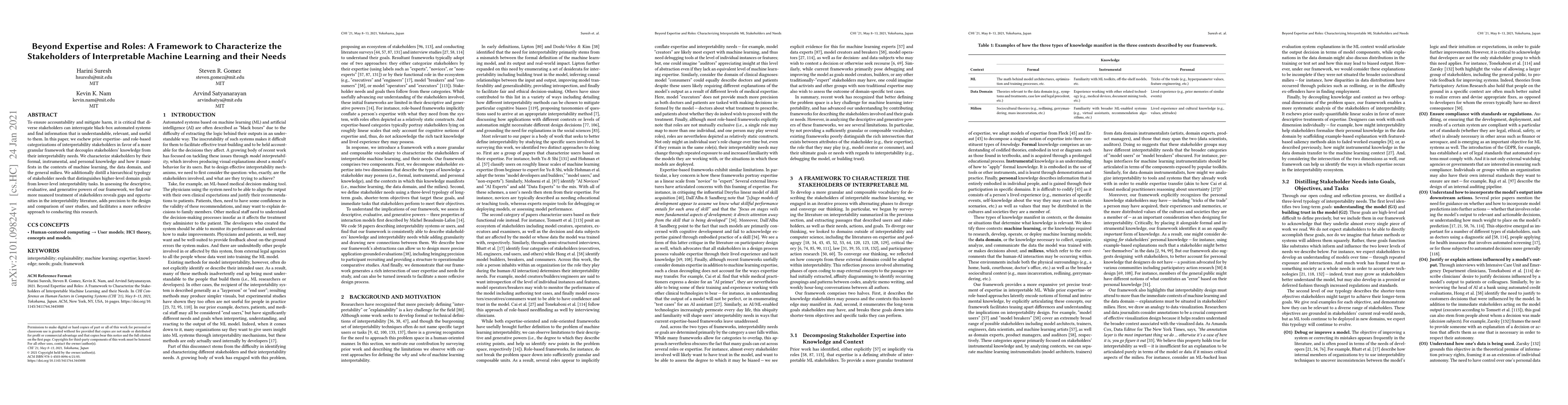 To ensure accountability and mitigate harm, it is critical that diverse stakeholders can interrogate black-box automated systems and find information that is understandable, relevant, and useful to them. In this paper, we eschew prior expertise- and role-based categorizations of interpretability stakeholders in favor of a more granular framework that decouples stakeholders' knowledge from their interpretability needs. We characterize stakeholders by their formal, instrumental, and personal knowledge and how it manifests in the contexts of machine learning, the data domain, and the general milieu. We additionally distill a hierarchical typology of stakeholder needs that distinguishes higher-level domain goals from lower-level interpretability tasks. In assessing the descriptive, evaluative, and generative powers of our framework, we find our more nuanced treatment of stakeholders reveals gaps and opportunities in the interpretability literature, adds precision to the design and comparison of user studies, and facilitates a more reflexive approach to conducting this research.