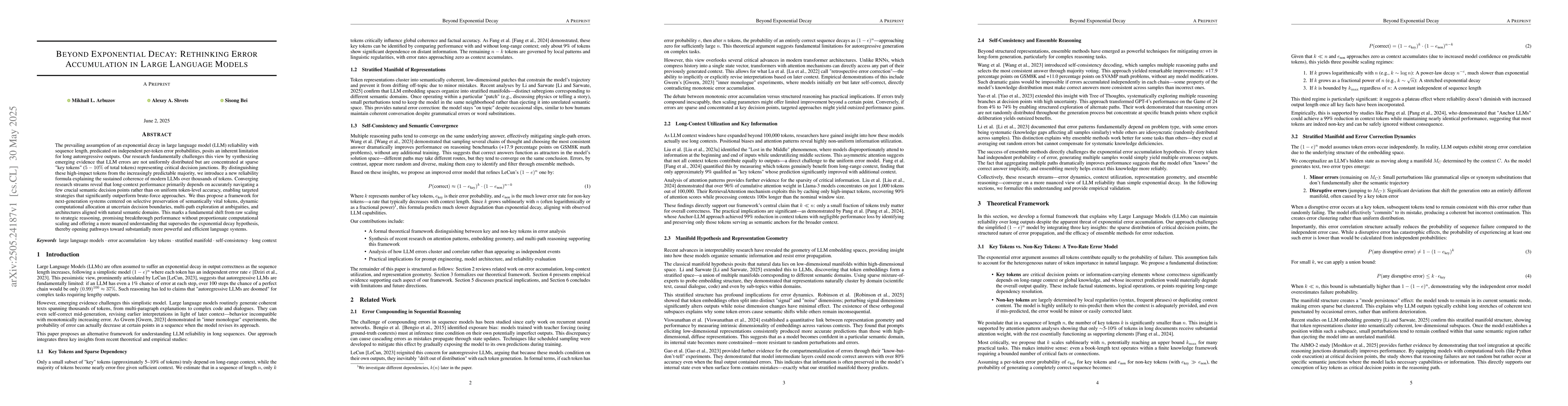 The prevailing assumption of an exponential decay in large language model (LLM) reliability with sequence length, predicated on independent per-token error probabilities, posits an inherent limitation for long autoregressive outputs. Our research fundamentally challenges this view by synthesizing emerging evidence that LLM errors are not uniformly distributed but are concentrated at sparse "key tokens" ($5-10\%$ of total tokens) representing critical decision junctions. By distinguishing these high-impact tokens from the increasingly predictable majority, we introduce a new reliability formula explaining the sustained coherence of modern LLMs over thousands of tokens. Converging research streams reveal that long-context performance primarily depends on accurately navigating a few crucial semantic decision points rather than on uniform token-level accuracy, enabling targeted strategies that significantly outperform brute-force approaches. We thus propose a framework for next-generation systems centered on selective preservation of semantically vital tokens, dynamic computational allocation at uncertain decision boundaries, multi-path exploration at ambiguities, and architectures aligned with natural semantic domains. This marks a fundamental shift from raw scaling to strategic reasoning, promising breakthrough performance without proportionate computational scaling and offering a more nuanced understanding that supersedes the exponential decay hypothesis, thereby opening pathways toward substantially more powerful and efficient language systems.