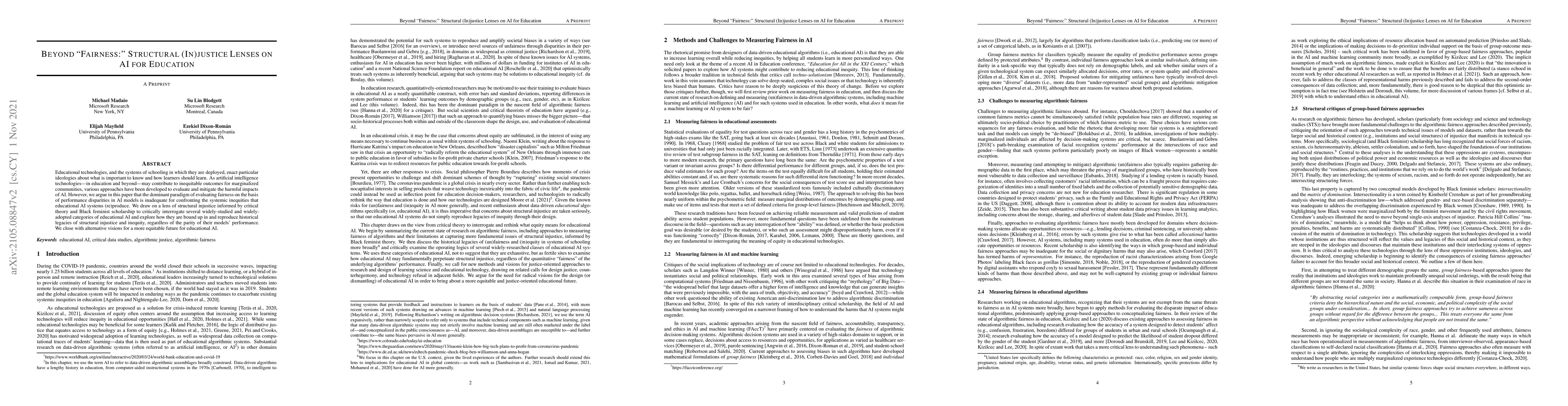 Educational technologies, and the systems of schooling in which they are deployed, enact particular ideologies about what is important to know and how learners should learn. As artificial intelligence technologies -- in education and beyond -- may contribute to inequitable outcomes for marginalized communities, various approaches have been developed to evaluate and mitigate the harmful impacts of AI. However, we argue in this paper that the dominant paradigm of evaluating fairness on the basis of performance disparities in AI models is inadequate for confronting the systemic inequities that educational AI systems (re)produce. We draw on a lens of structural injustice informed by critical theory and Black feminist scholarship to critically interrogate several widely-studied and widely-adopted categories of educational AI and explore how they are bound up in and reproduce historical legacies of structural injustice and inequity, regardless of the parity of their models' performance. We close with alternative visions for a more equitable future for educational AI.